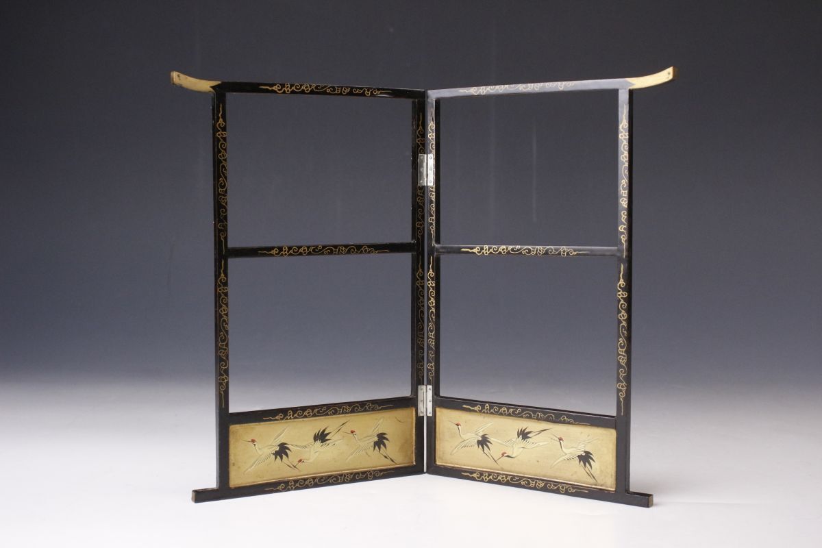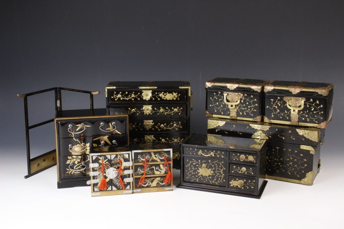 黒漆塗に施された唐草文や鶴松、花鳥図の蒔絵が華やかな時代雛道具九点のご紹介です