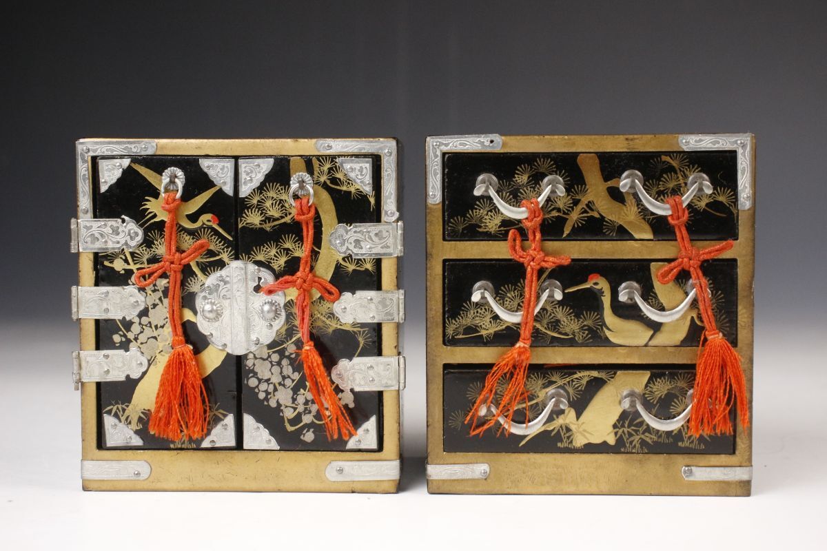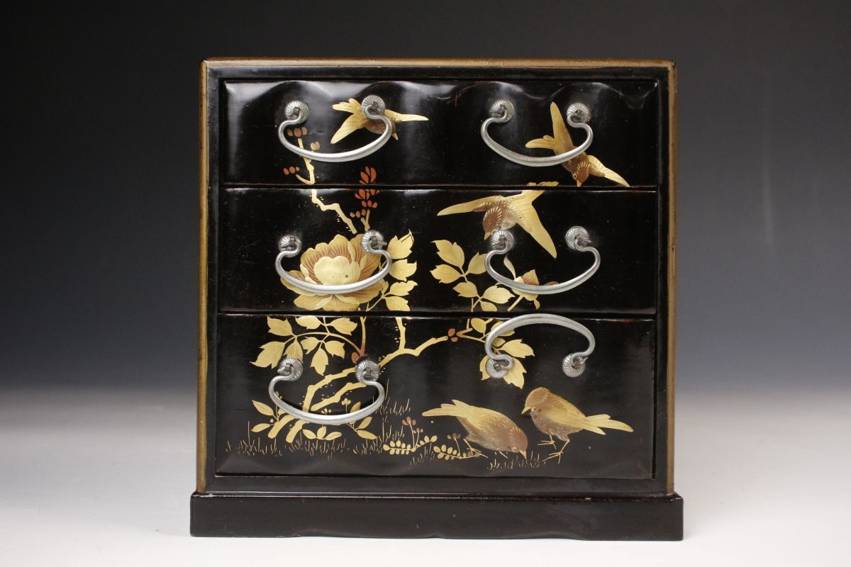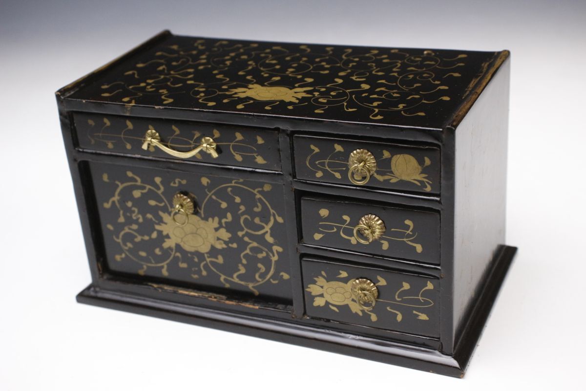 菊文の金具と唐草文蒔絵の箪笥や