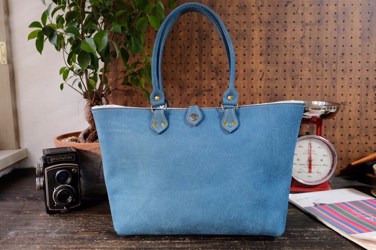 ◆◇イタリア産霜降りターコイズブッテロ牛革バックスキンレザートートバッグ Lサイズ大容量A4 作家手作り★床革日本製鞄帆布ブルー