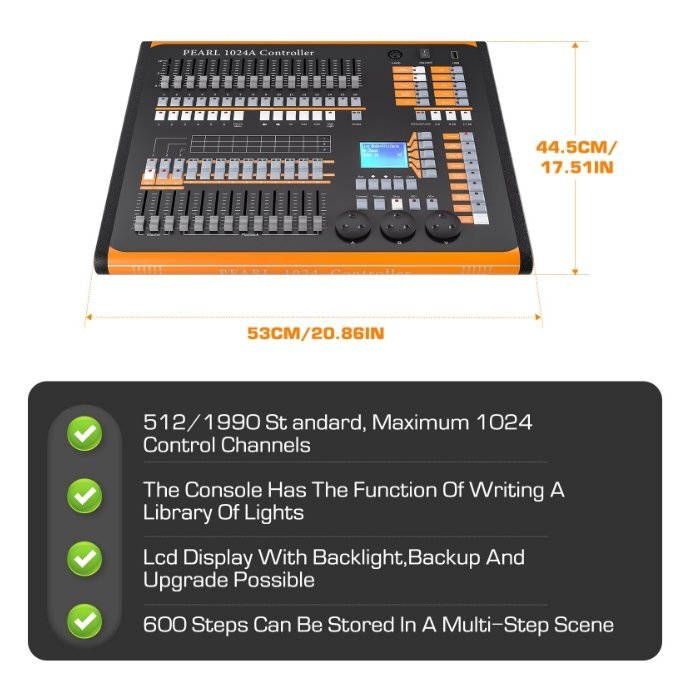1. 512/1990 規格、最大 1024 の制御チャンネル、光絶縁信号出力 -L 制御最大 96 調光ボリュームまたは 96 チャンネル、パール ランプ ヘッドを使用。