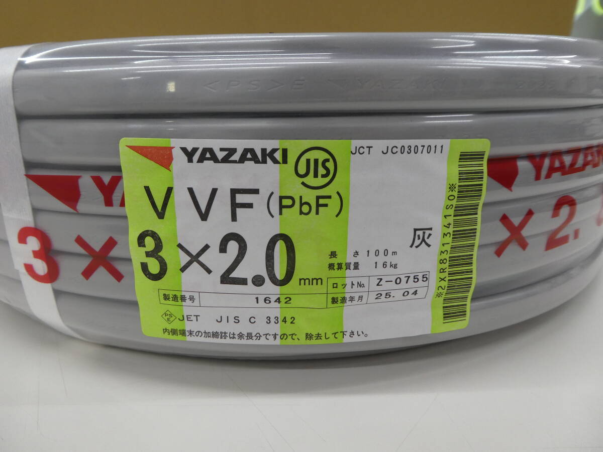 Product name: ☆ 未使用 保管品 YAZAKI 矢崎 VVFケーブル 3×2.0mm 100m 灰 2025年 4月製造 1円スタート ☆