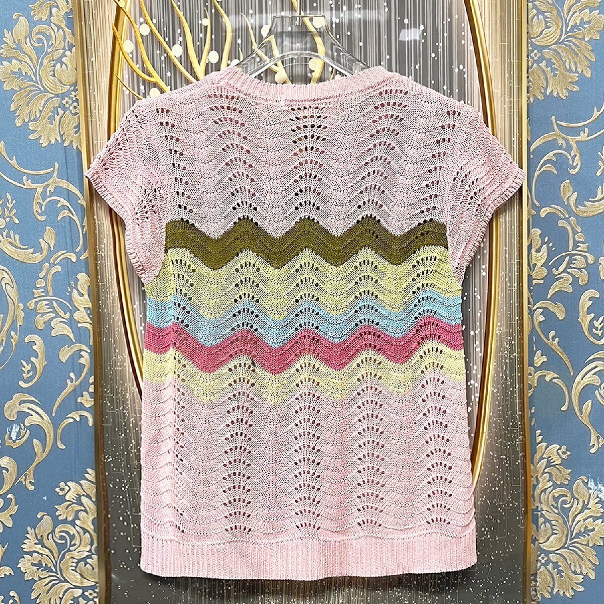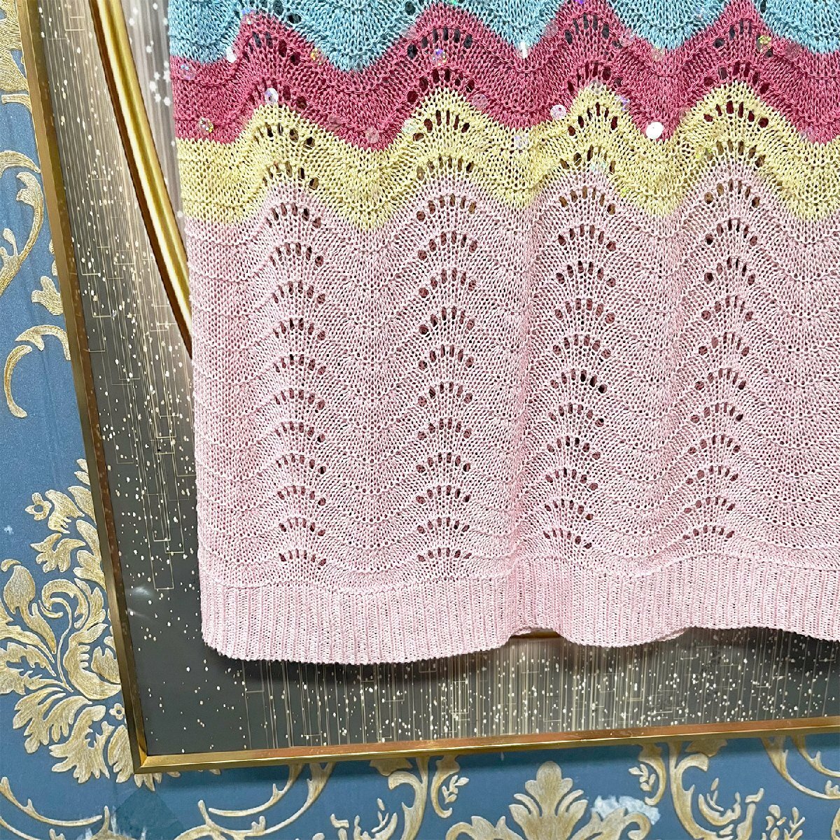 通気性の高い透かし編みデザインで、夏でも蒸れにくく快適。華やかな色使いと遊び心あふれるデザインが魅力のサマーニットトップスです。全体には愛らしさを感じさせる編み地をベースに、レインボーカラーの波模様とキラキラ輝くスパンコールを散りばめています。日が差すとキラキラしているのがポイントで、着れば人目を引く。
