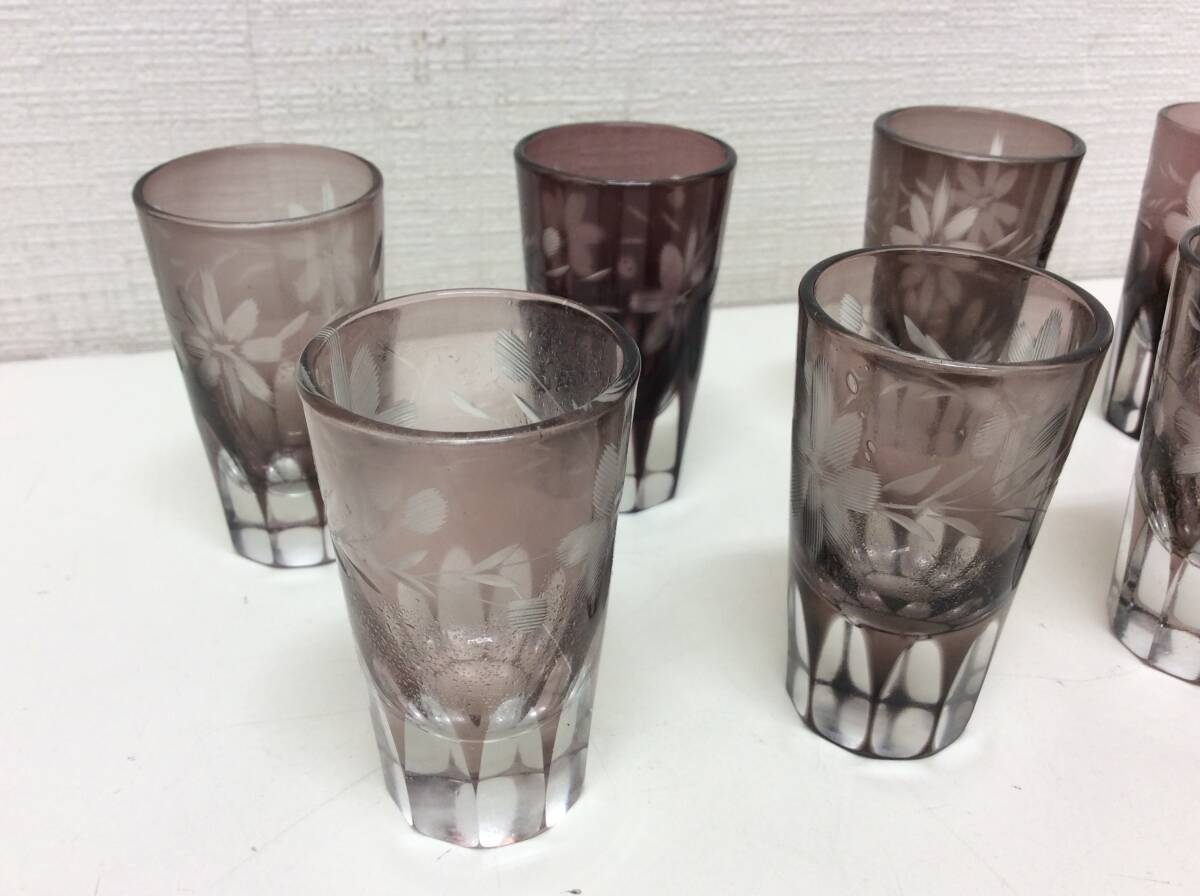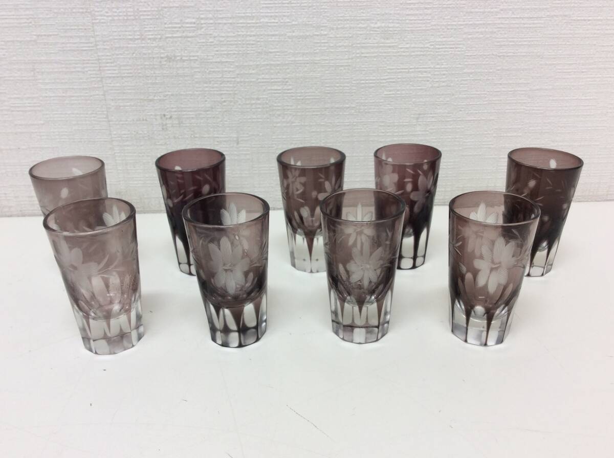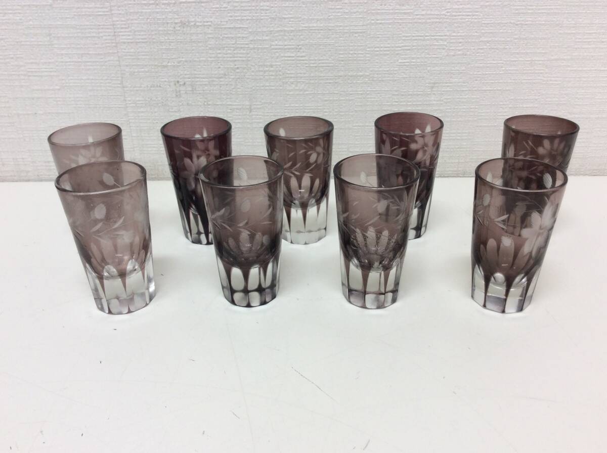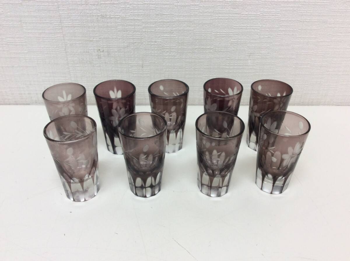 ■3341 切子グラス ショットグラス 9点セット あずき色 レトロ アンティーク お猪口 ぐい呑み ガラス食器 長期保管品