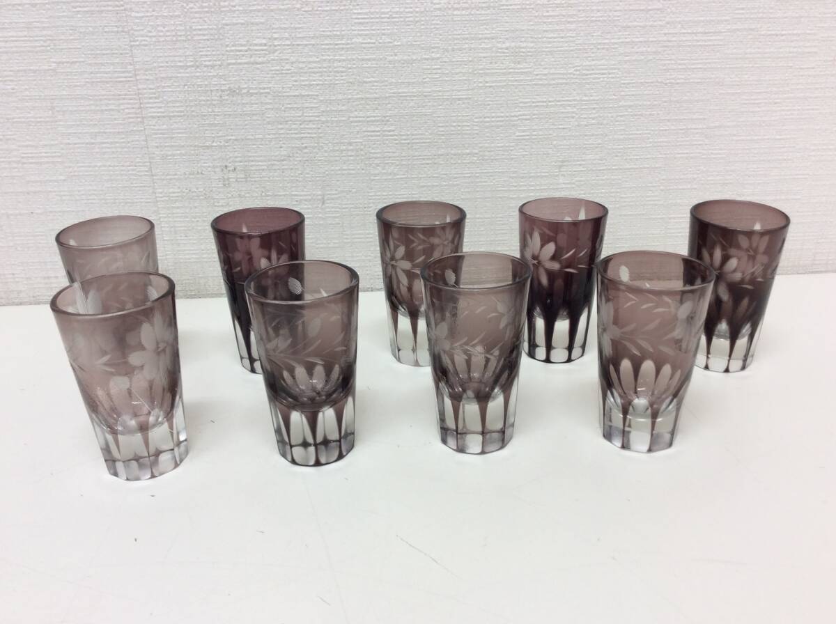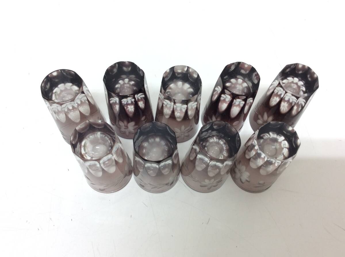 Product name: ■3341 切子グラス ショットグラス 9点セット あずき色 レトロ アンティーク お猪口 ぐい呑み ガラス食器 長期保管品