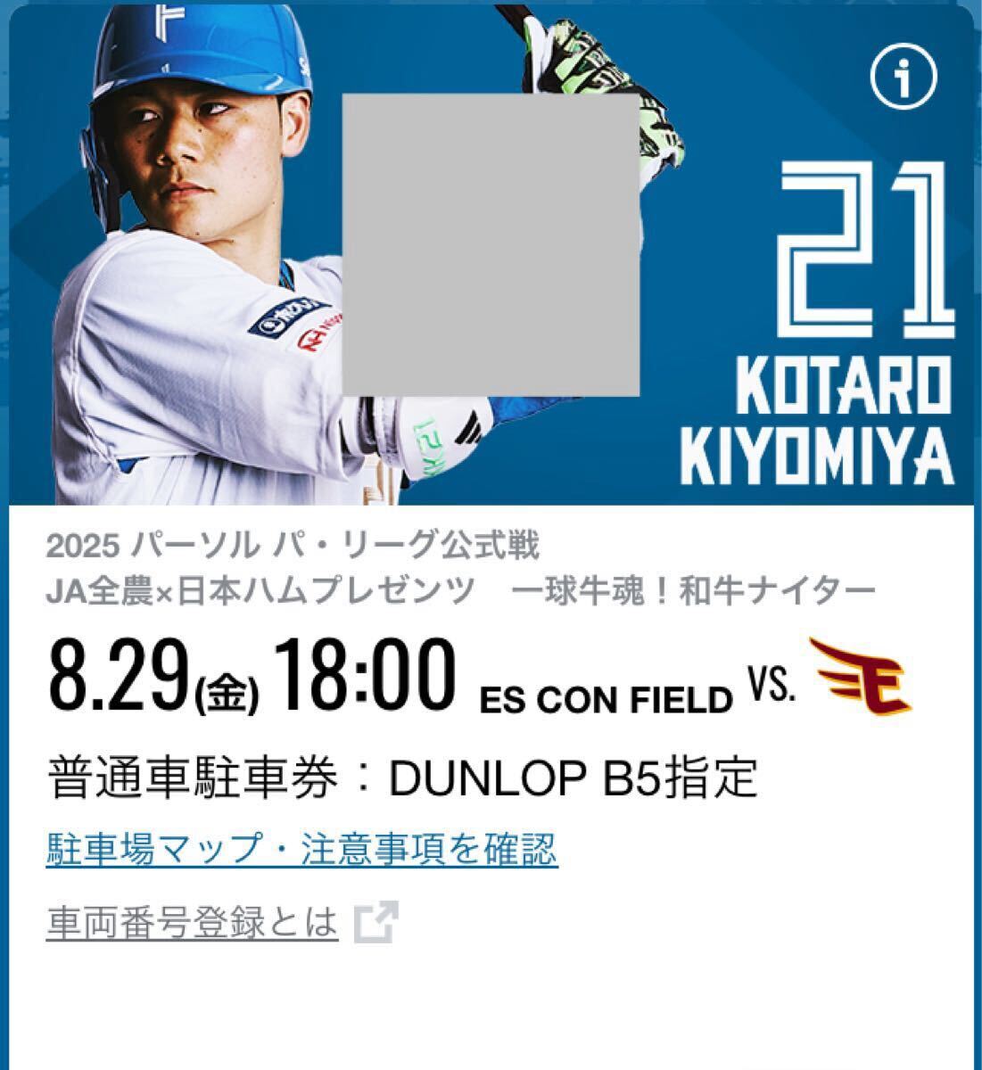 8月29日(金) エスコンフィールド 普通車駐車券 日本ハム ファイターズ 駐車場 エスコンフィールド駐車券 ダンロップパーキング 8/29(金)