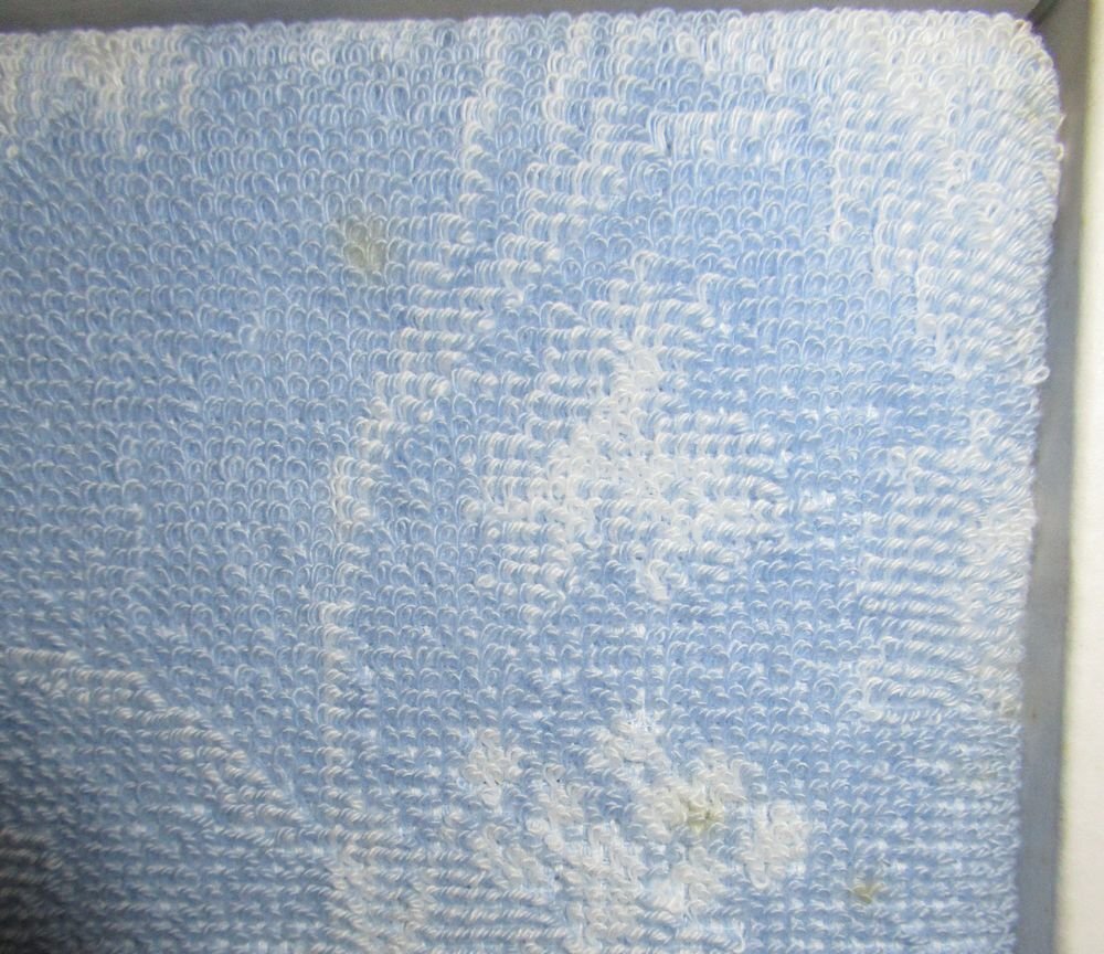 自宅保管しておりましたお箱入りの未使用品になりますが、全体的に保管時のシミがあります。今までの経験からシミ取りハイターのつけ置き洗いで落ちる可能性が高いかと個人的には思いますが…
