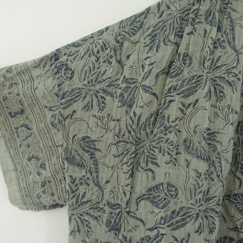 2024年コレクション pas de calaisのコットンプリントブラウスです。カラーは製品染めが施されたくすみグリーンベースにグレー・チャコールの総柄プリントで、透け感ある柔らかな薄手ガーゼのような綿素材です。首元&前袖にギャザーが施されており、身幅広めのデザインです。フロントボタンで着脱でき、袖口は布耳仕様で、後ろ裾丈が長めです。定価(メーカー希望小売価格)29,700円の商品です。