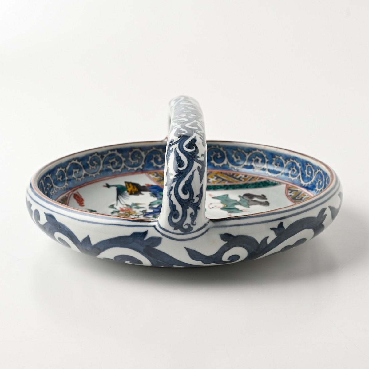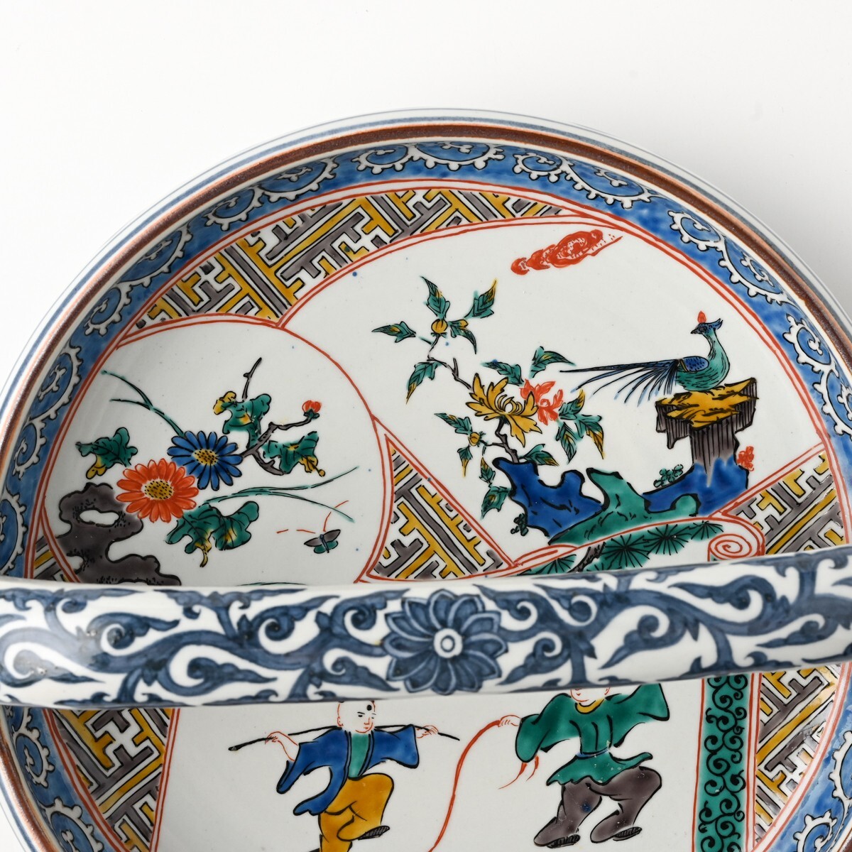 Product name: 関山造 九谷焼 色絵 唐子花鳥唐草文 手付鉢 角福 直径約250mm 高さ約100mm 古九谷様式 盛鉢 菓子鉢 骨董 古美術 古道具 アンティーク