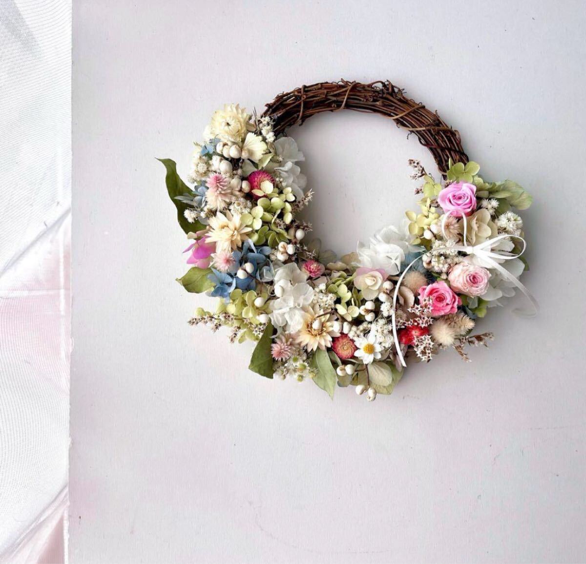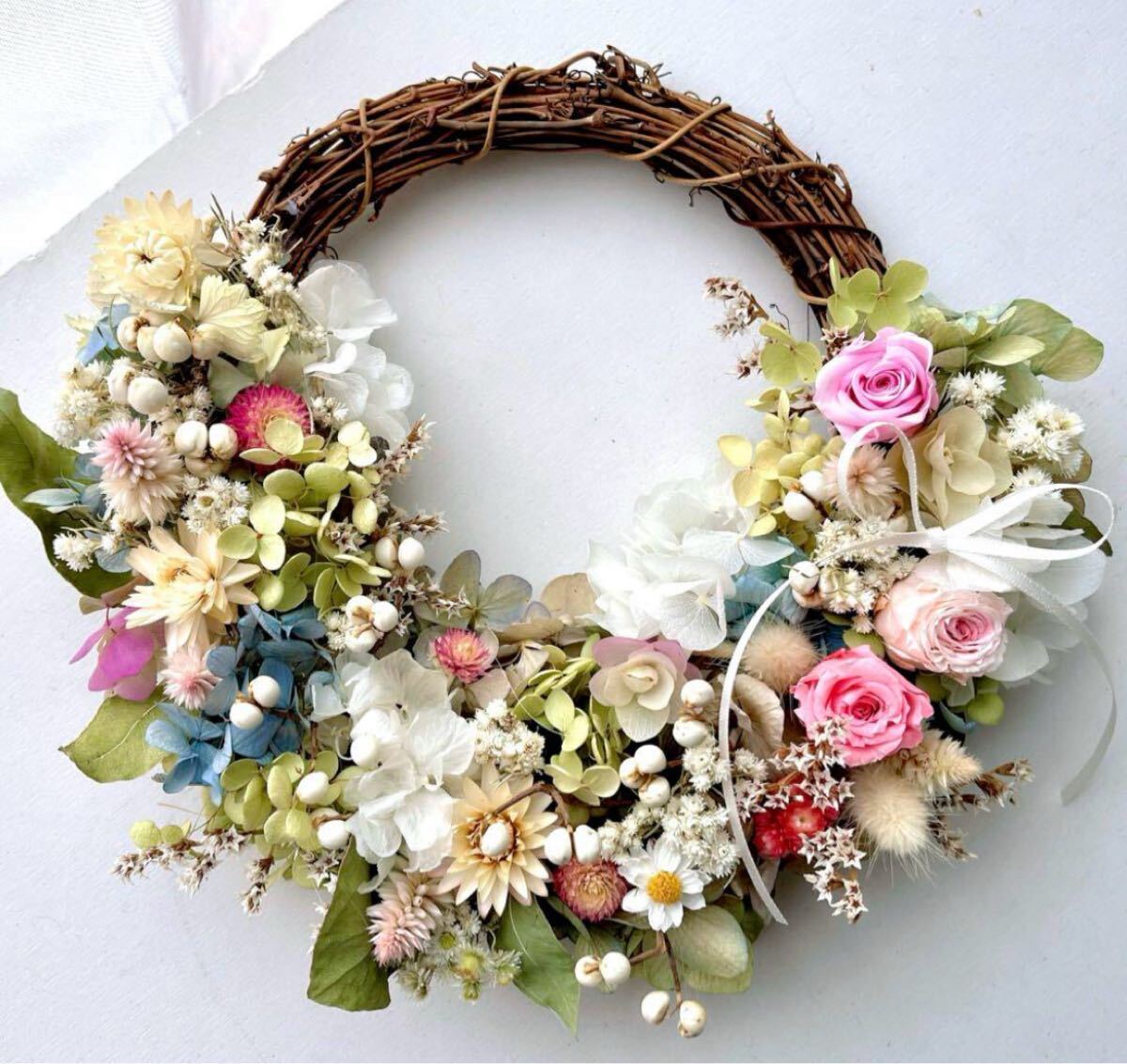 彩り豊かな紫陽花と花々を紡いだリースです。