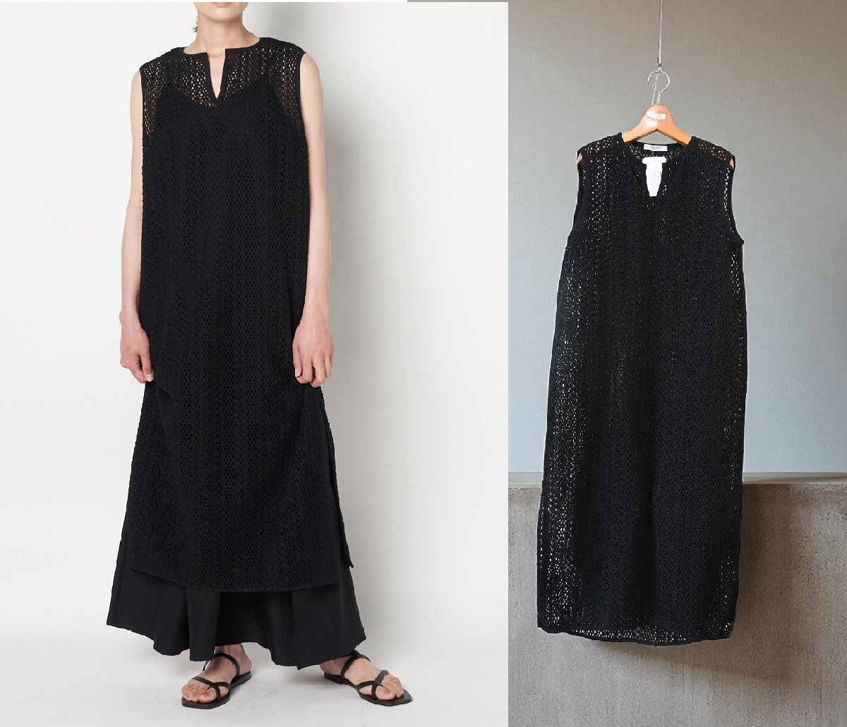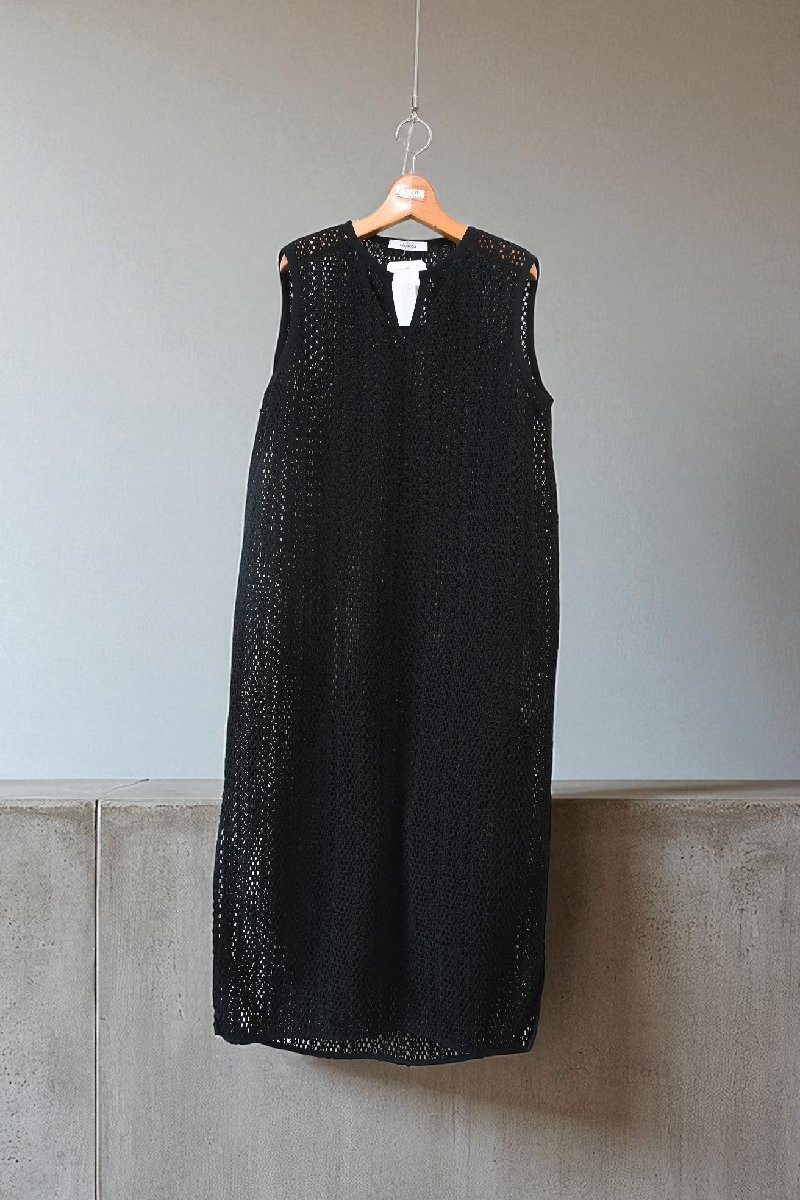 クロシェ編みレースのノースリーブワンピース。