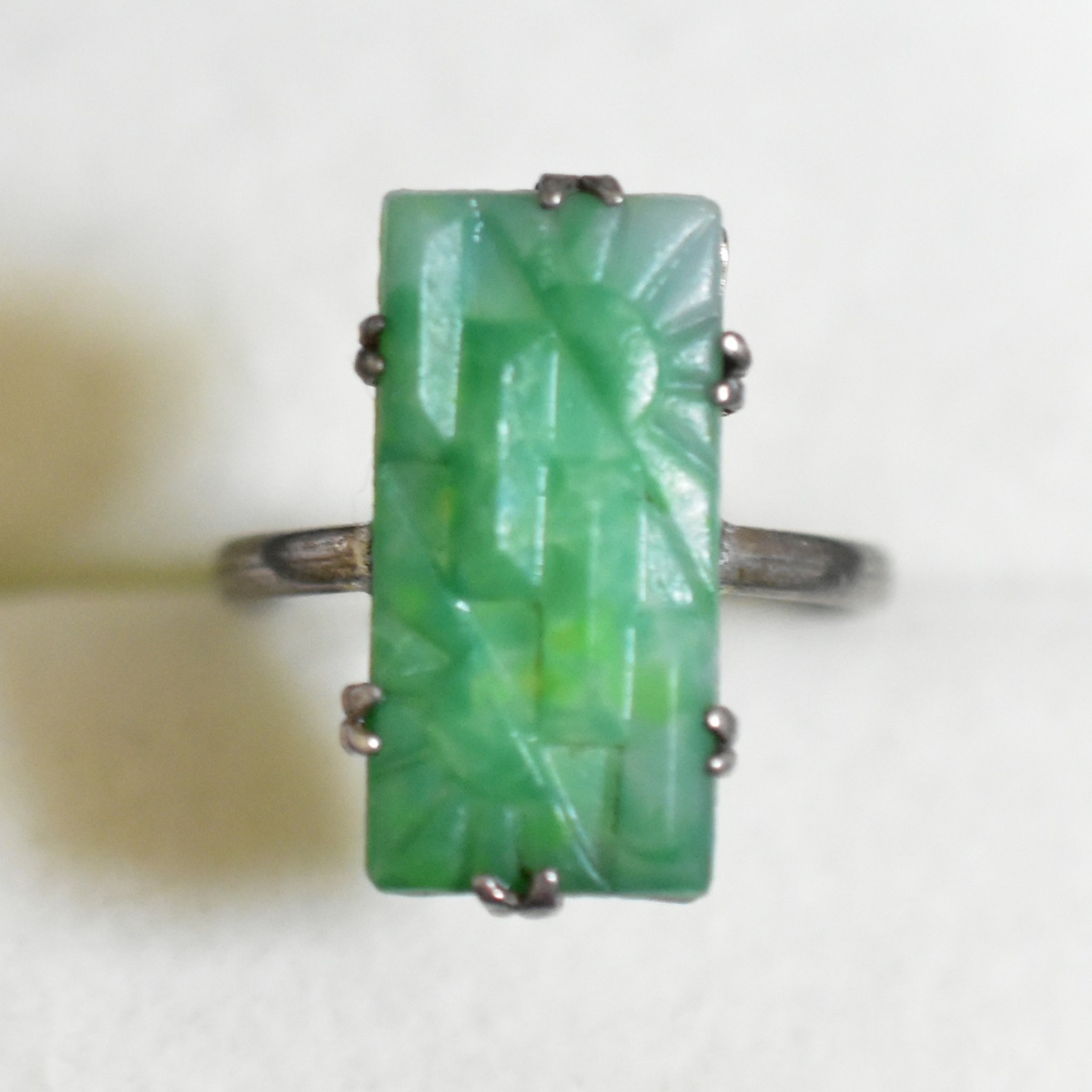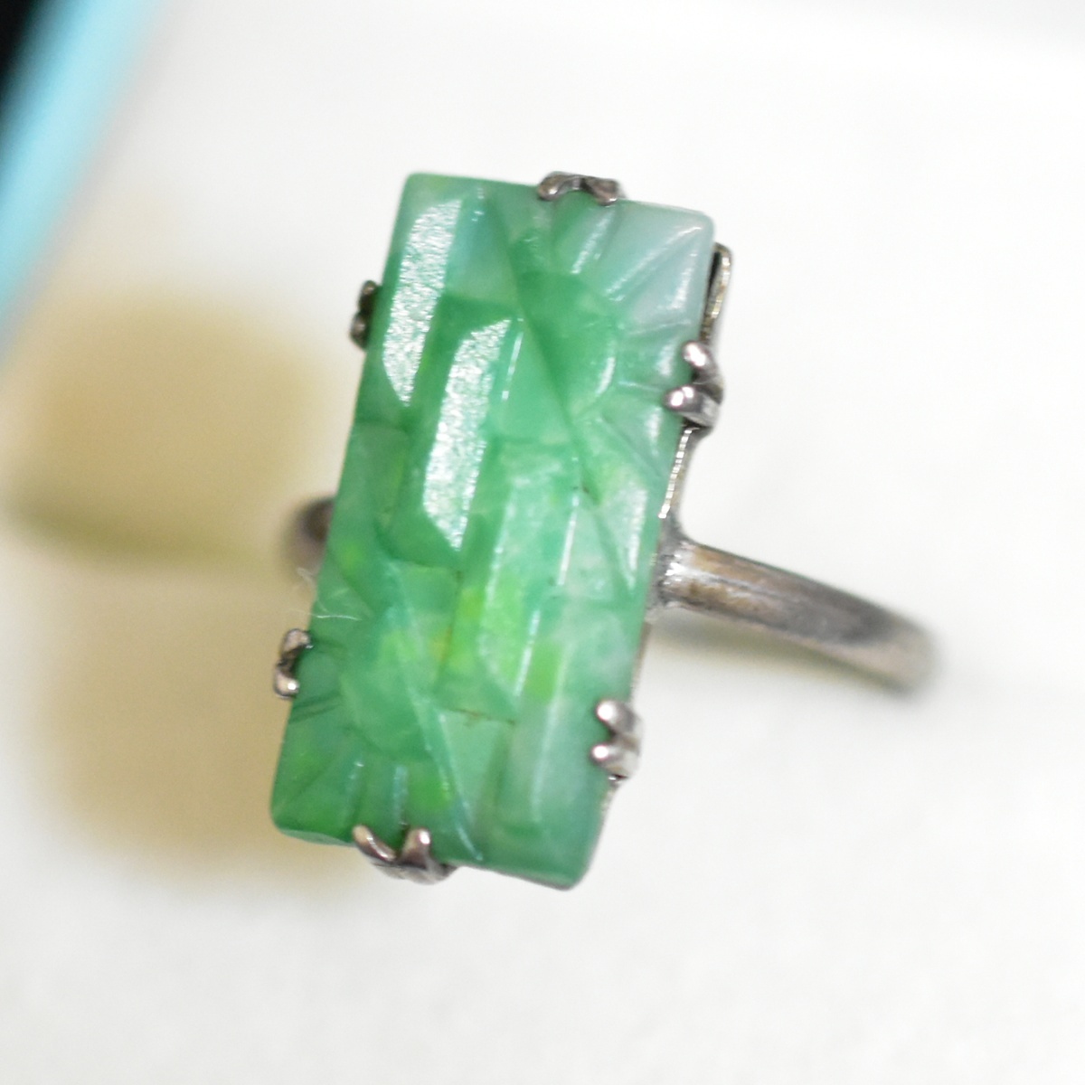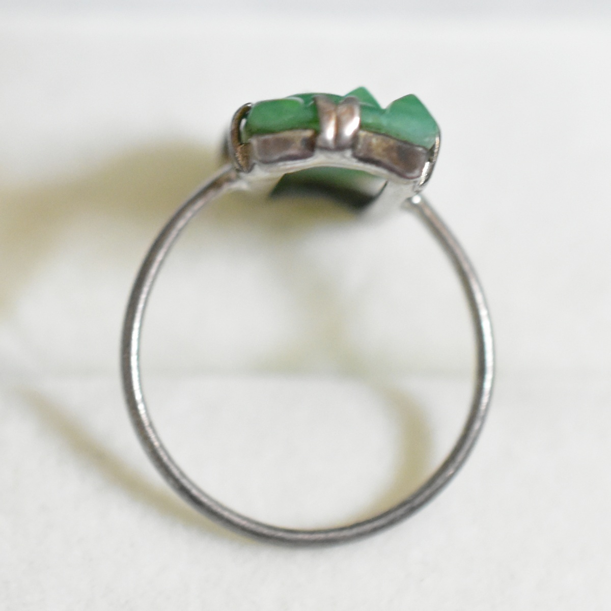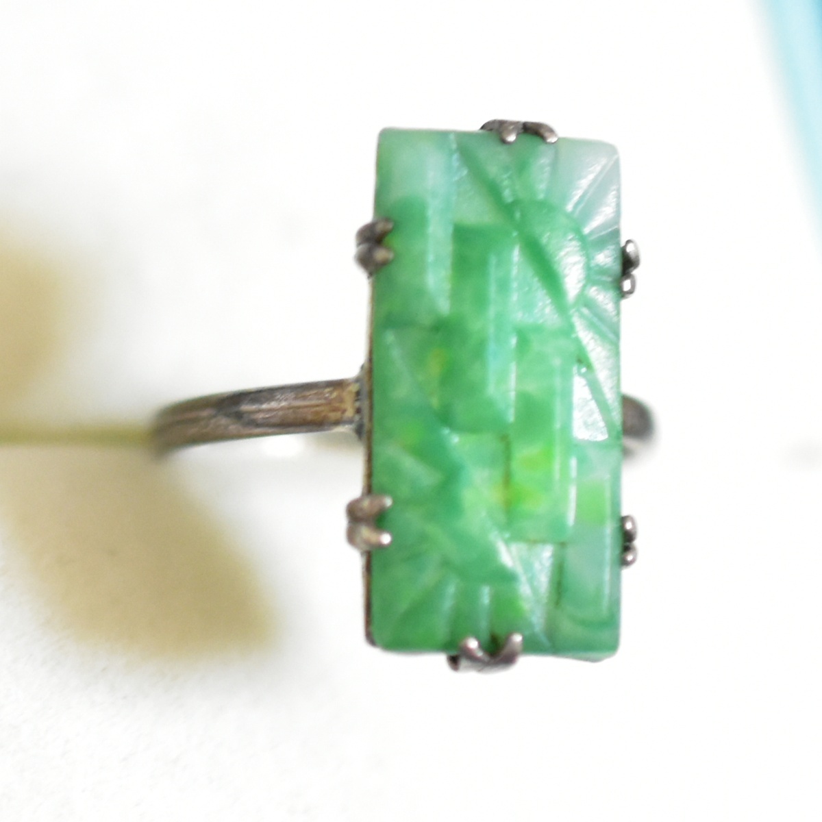 アールデコの美しい純銀製翡翠色古ガラスのリングです。