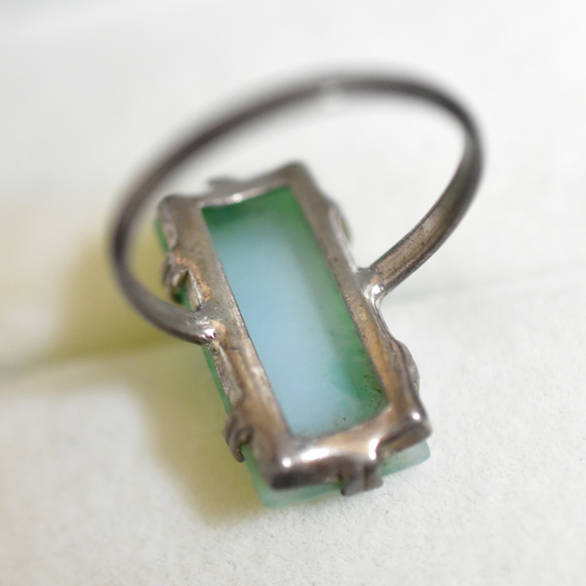英国アンティーク 純銀製/Silver/シルバー刻印あり アールデコ 翡翠色ガラスの銀製リング/指輪 本物保証