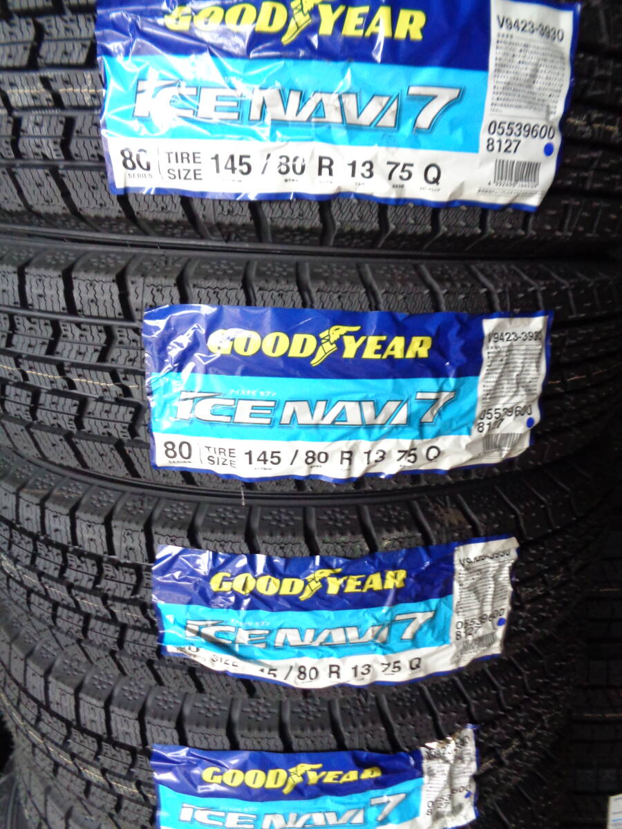 S363 冬用グッドイヤーICENAVI7 145/80R13 75Q 新品未使用、日本製・在庫処分価格 お買得!スタッドレスタイヤ4本!