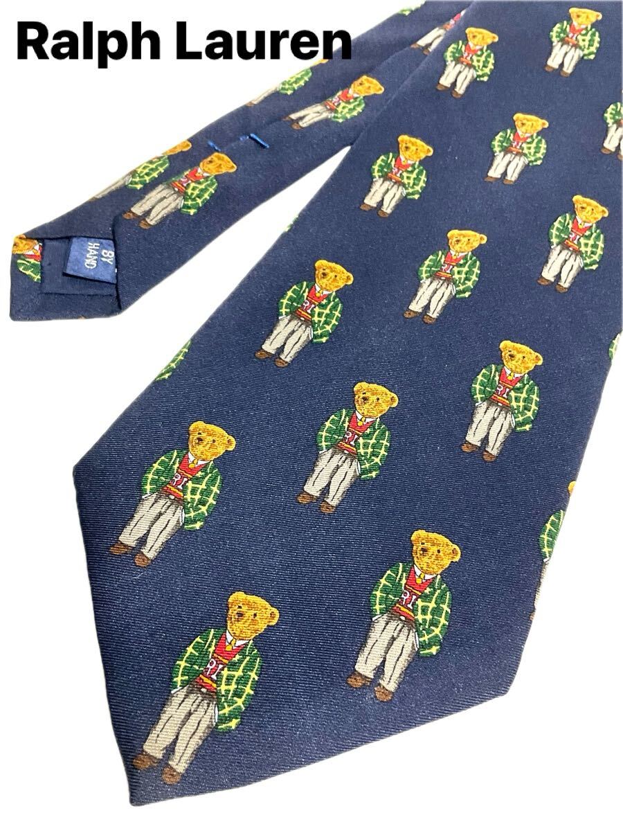 Ralph Lauren ラルフローレン ネクタイ ネイビー×グリーン系 ポロベア 柄 ポロラルフローレン POLO ハンドメイド 送料185円(追跡付)〜