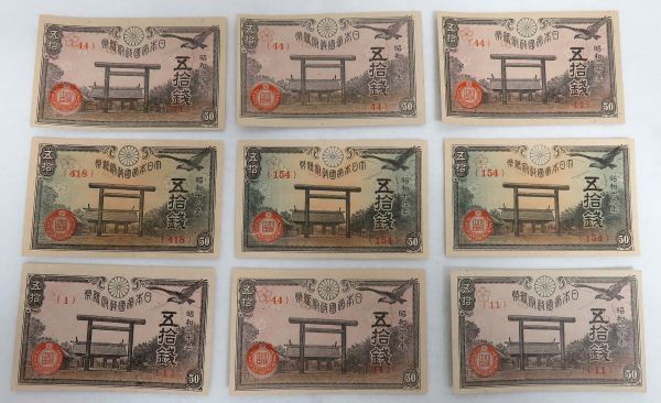 Product name: 【古紙幣50銭おまとめ】 約356枚/ 政府紙幣50銭 靖国50銭、 政府紙幣50銭 富士桜50銭、 日華事変軍票 丁号 50銭、 大正小額紙幣50銭