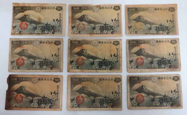 政府紙幣50銭 靖国50銭、 政府紙幣50銭 富士桜50銭、  日華事変軍票 丁号 50銭、 大正小額紙幣50銭の出品になります。