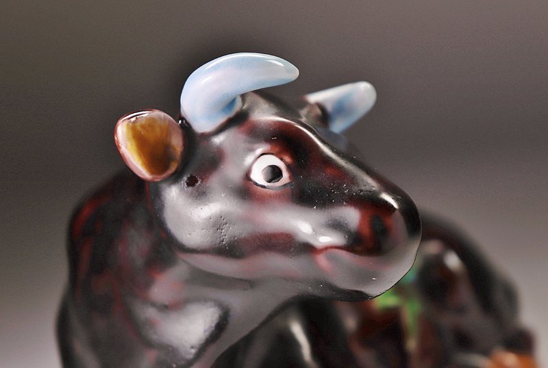 本作は暗色の釉薬を基調に肌が表され角や蹄には青、耳や尾には黄、背には緑を配した彩色により、落ち着きを備えた「臥牛」の置物です。 共箱には題名「野辺の憩い」と書き付けがあり、側面には草花を表した陽刻・貼り細工が施され、趣向を凝らした意匠となっております。 瞳のはっきりとした素朴な表情が印象的で、空間を和ませる温かな存在感をもつ一作です。