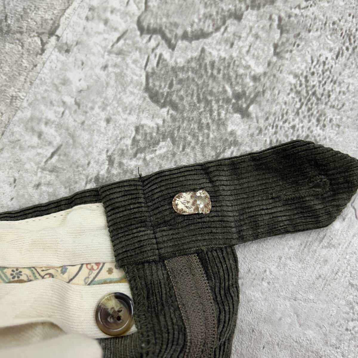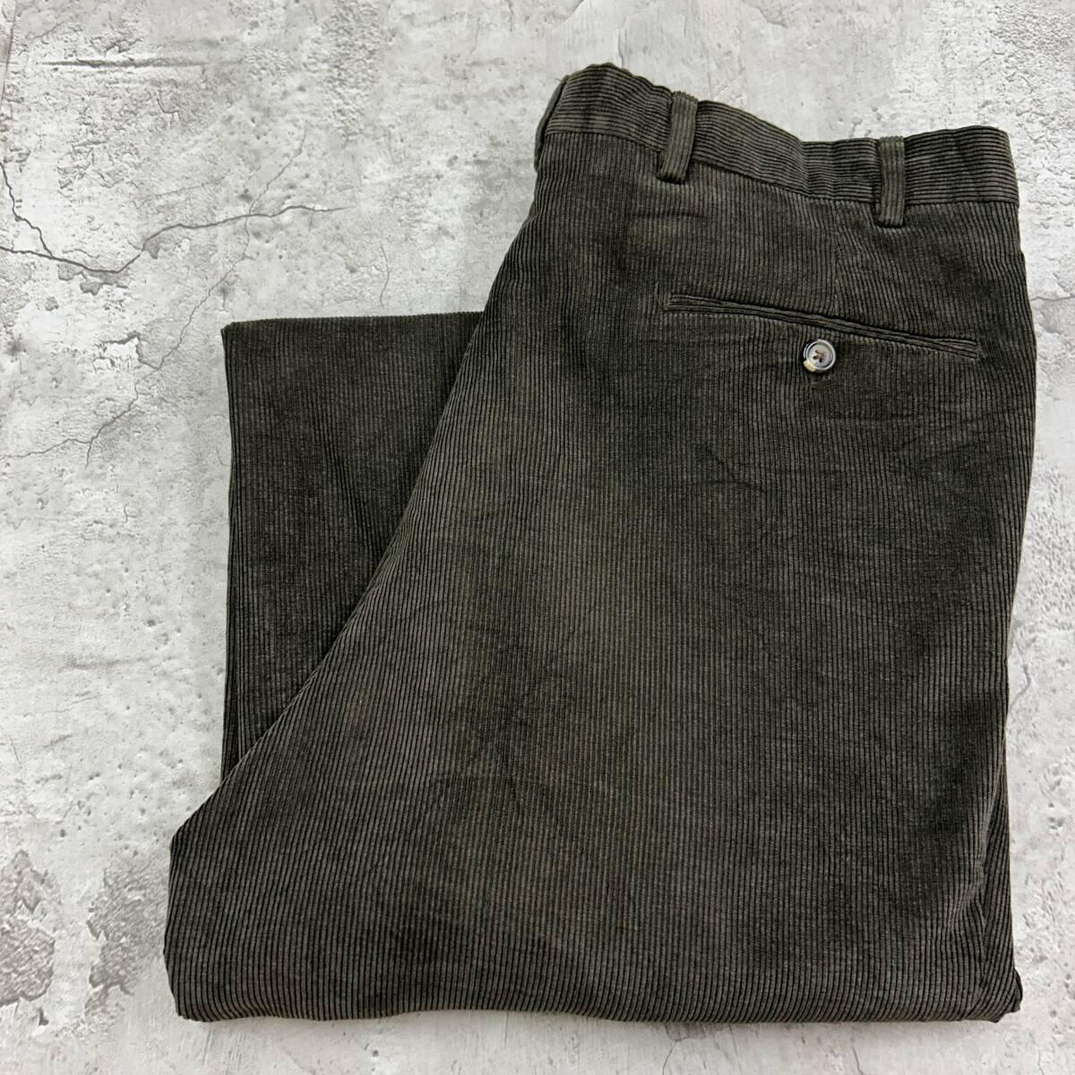 やや太畝のコーデュロイ素材で、落ち着いたチャコール〜オリーブ系の渋いトーン。