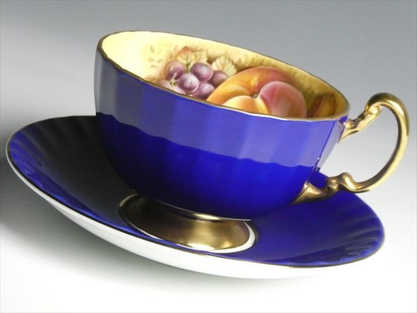 エインズレイ 最高級シリーズ オーチャードゴールド ③ コバルト 金彩 フルーツ絵 ハイハンドル カップ&ソーサー n564