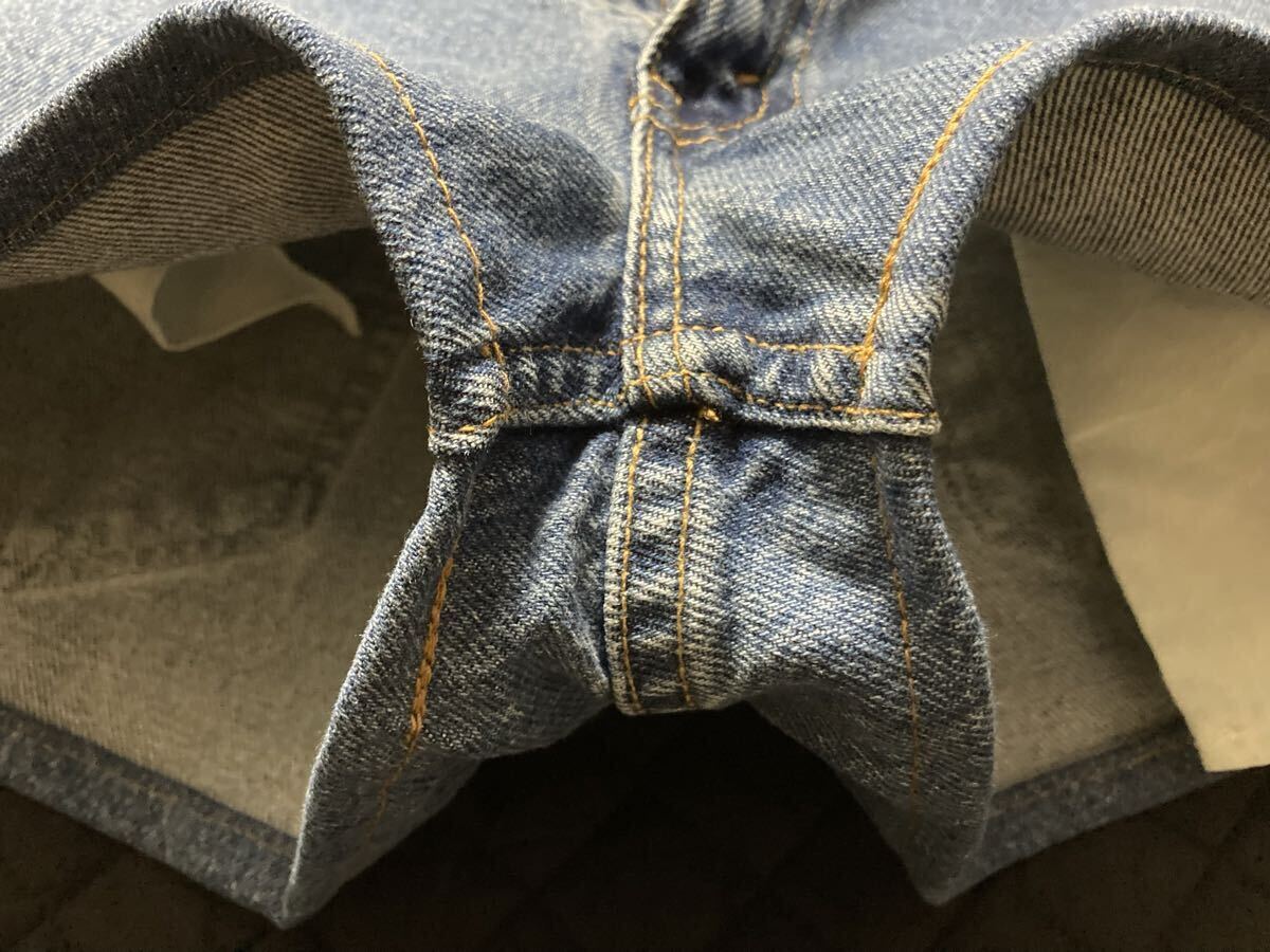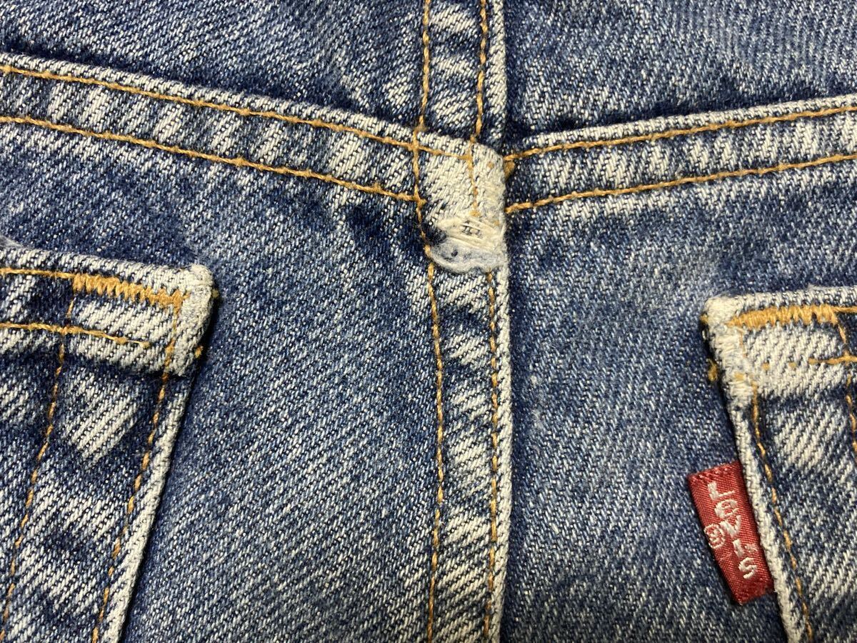 USED 褪色・擦れ・皮タグ劣化・前部右裾部に染み・お尻中央部に擦り傷が見受けられます。色はやや明るめのブルーウォッシュです。メキシコ製