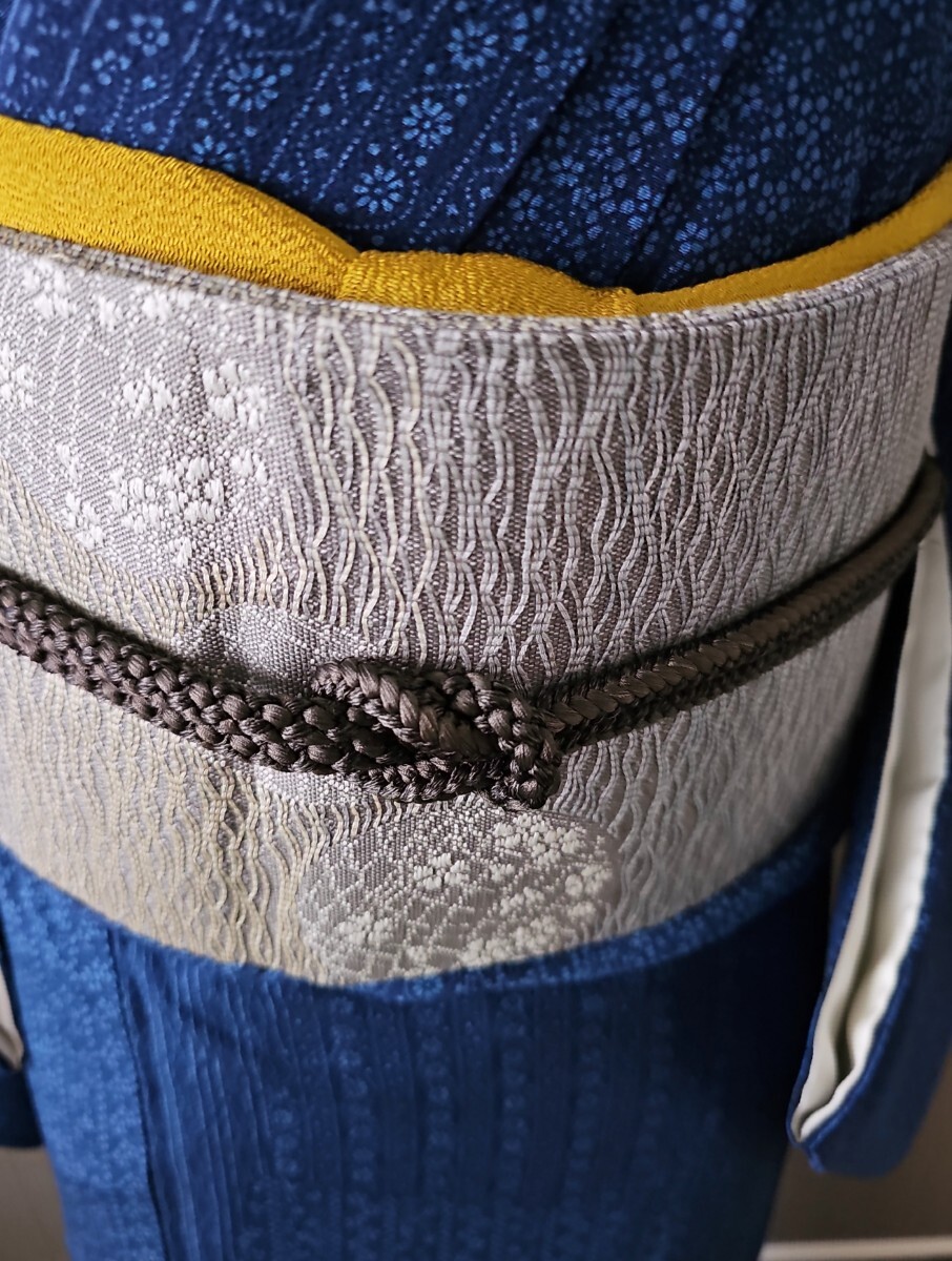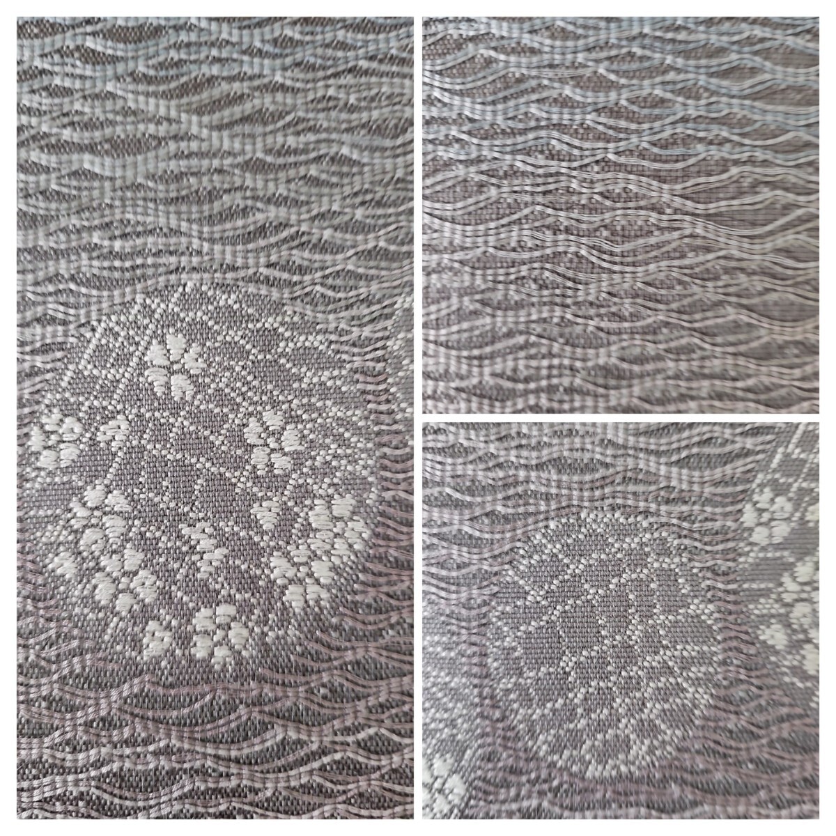 良い塩梅の張りと軽さの有る織地、藤鼠寄りのグレー系、暈し色分け、立体感がモダンな掬い織地文様に丸花文様が静かな華やかさに満ちた上等なお品ものでございます。