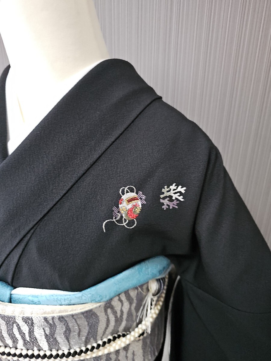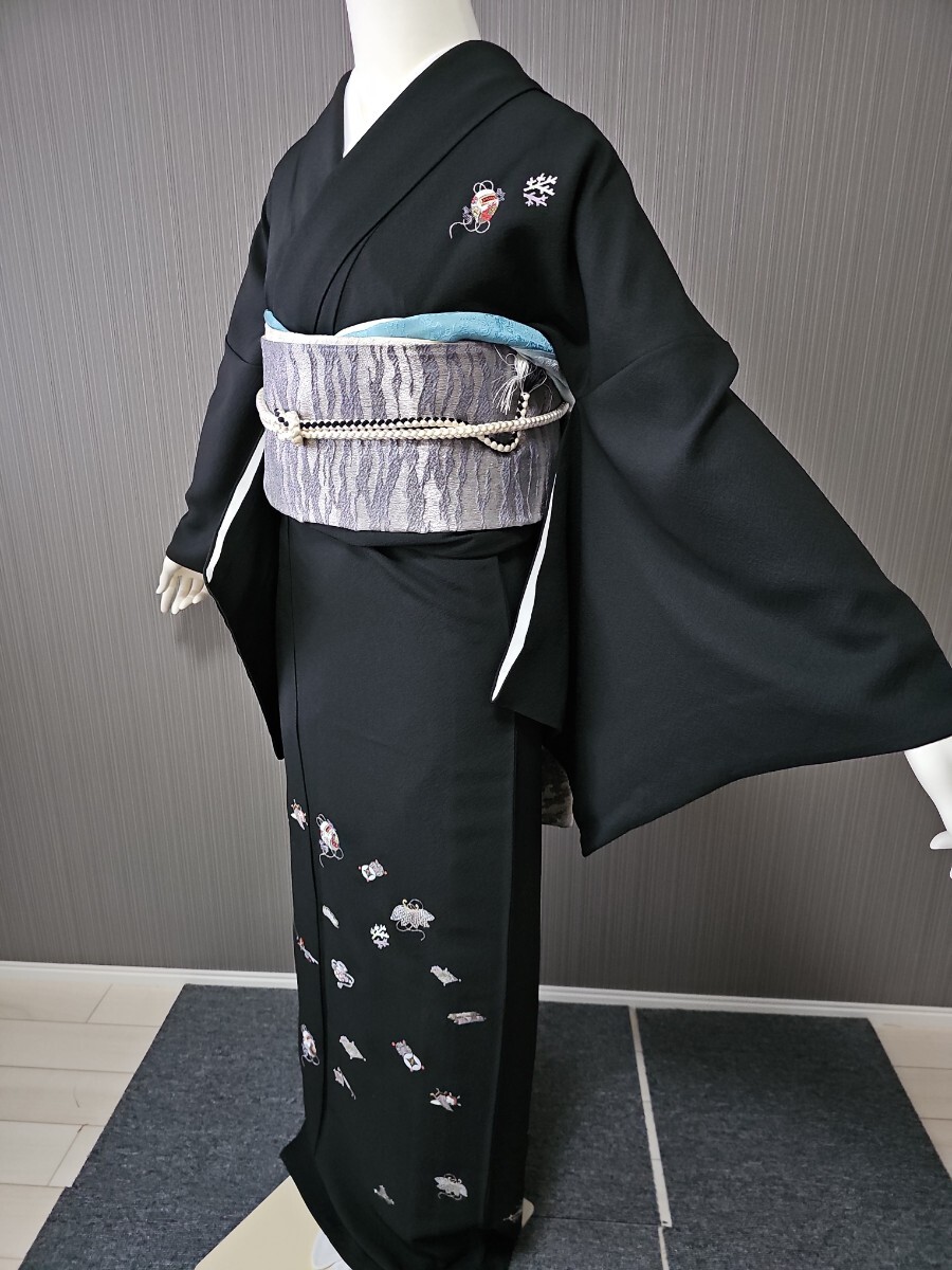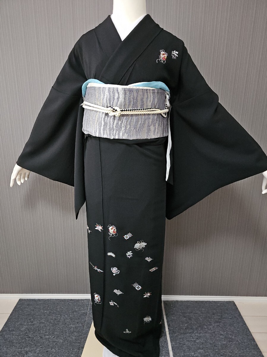 ★しっかりとした質感の上質縮緬生、深い黒地、前後身頃と右袂後ろ、左胸に金糸使いの宝尽くし文様を刺繍にて施した小粋なモダンさがお洒落さに満ちた上等なお召し物でございます。