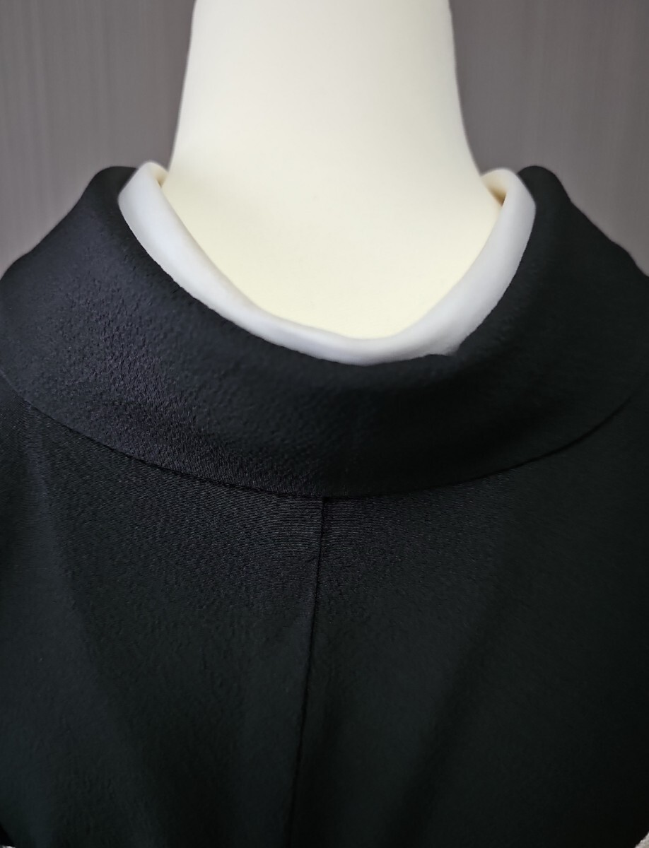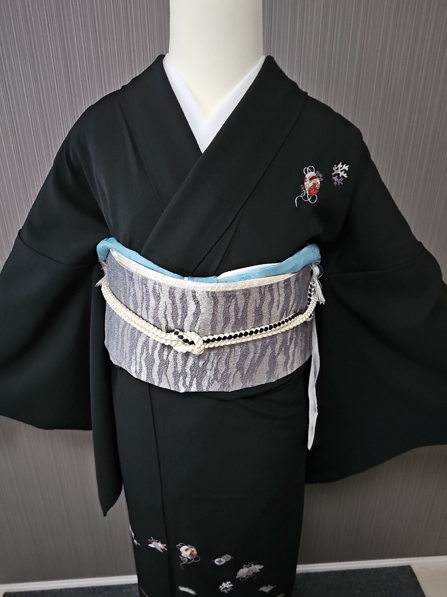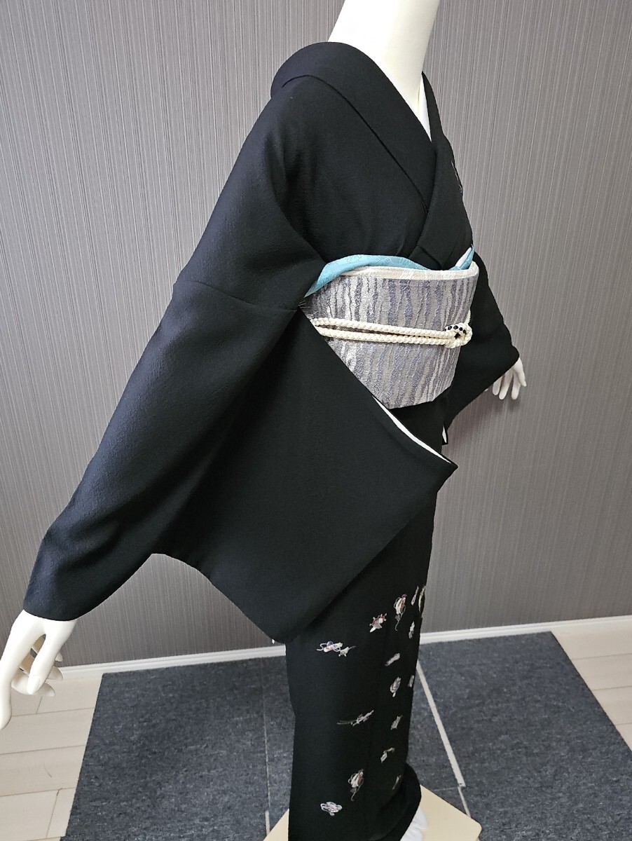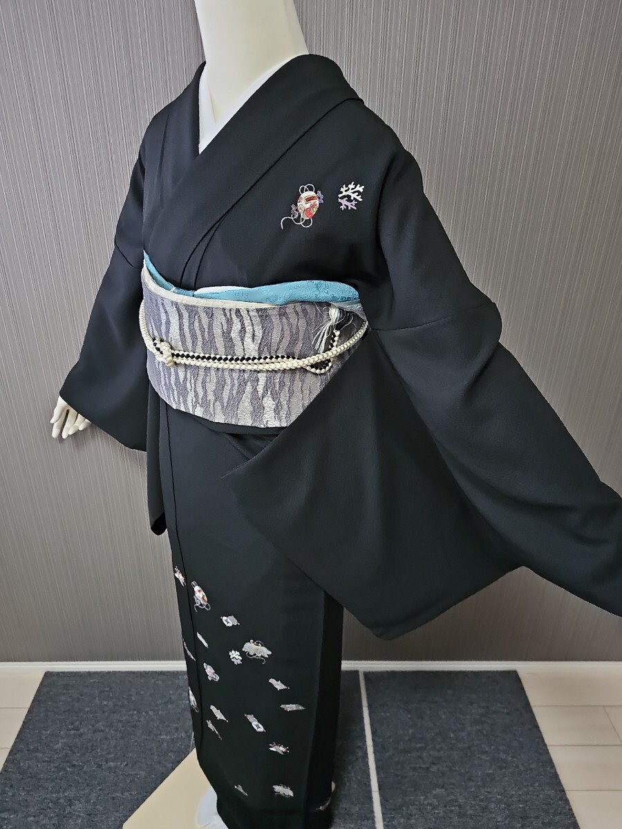 ★しっかりとした質感の上質縮緬生、深い黒地、前後身頃と右袂後ろ、左胸に金糸使いの宝尽くし文様を刺繍にて施した小粋なモダンさがお洒落さに満ちた上等なお召し物でございます。
