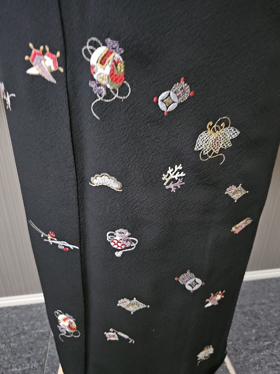 すずや■255正絹刺繍宝尽くし文様付け下げ  裄丈69.5cm  着丈169cm  黒