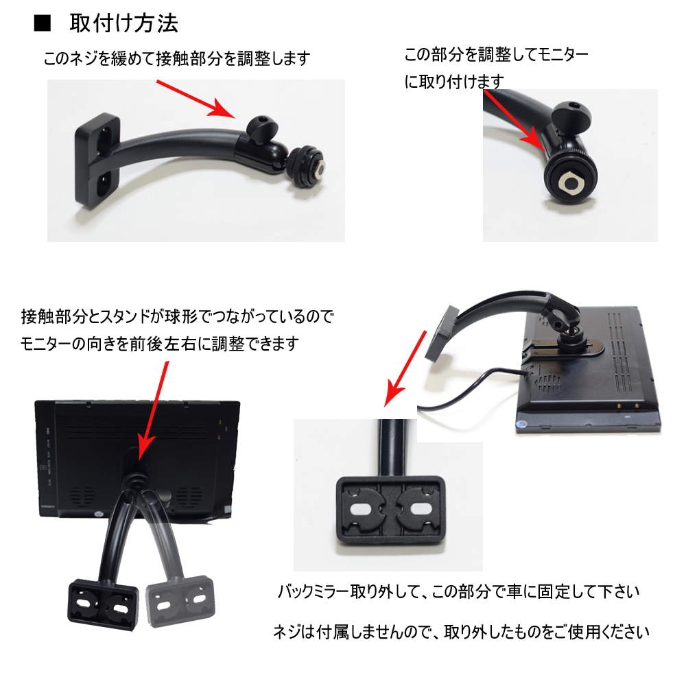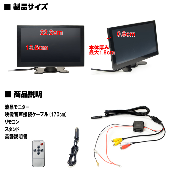 付属品     バックミラースタンド、シガー電源ケーブル、リモコン、配線説明書、