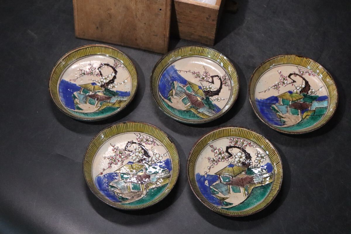 Product name: 九谷 銘 青手 「 梅に東屋 図 」 皿 5客 共箱付 / 九谷焼 銘々皿 煎茶道具 色絵 .B1316