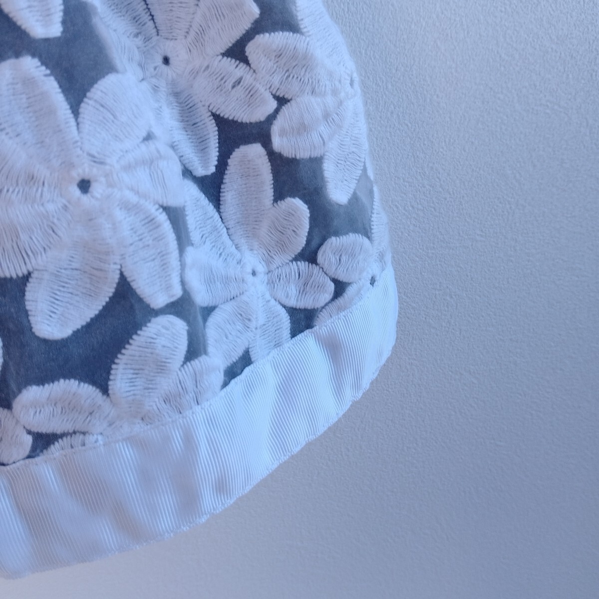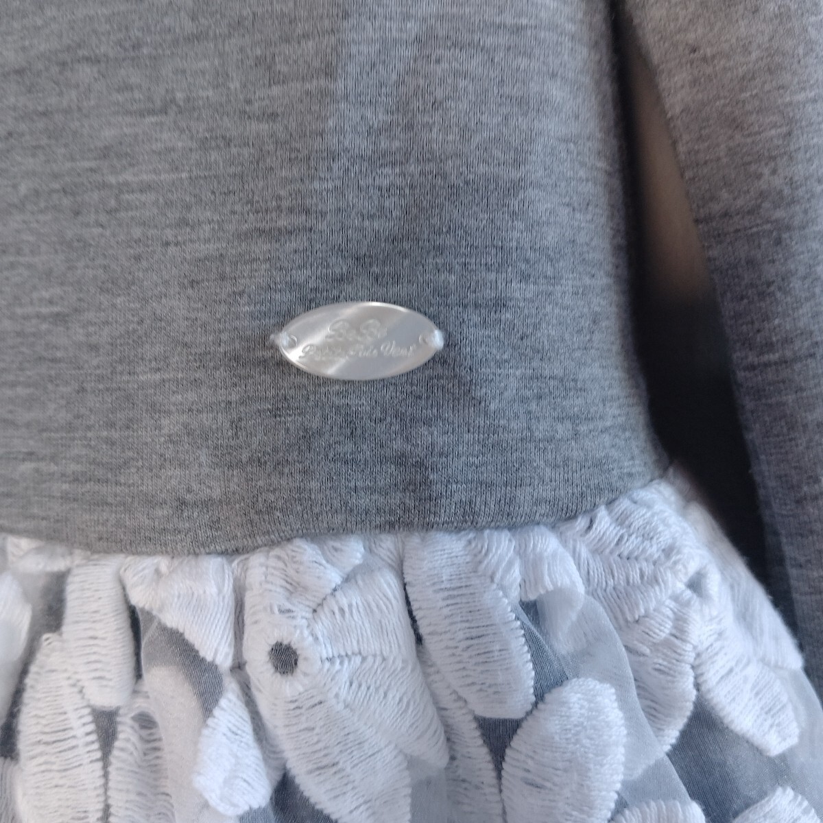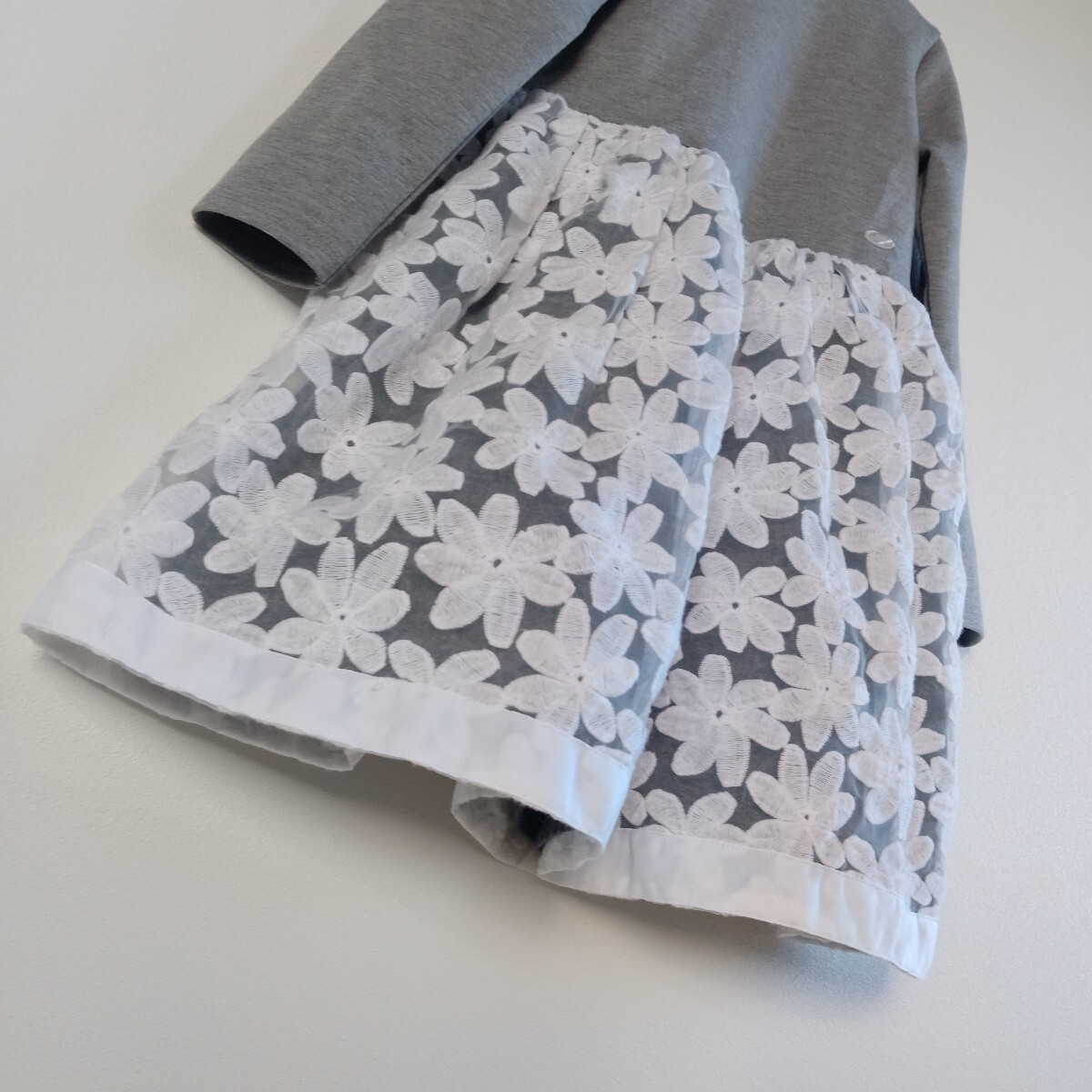 ローネックの薄いグレーポンチワンピースにマーガレットレースが付いたガーリーなワンピースです