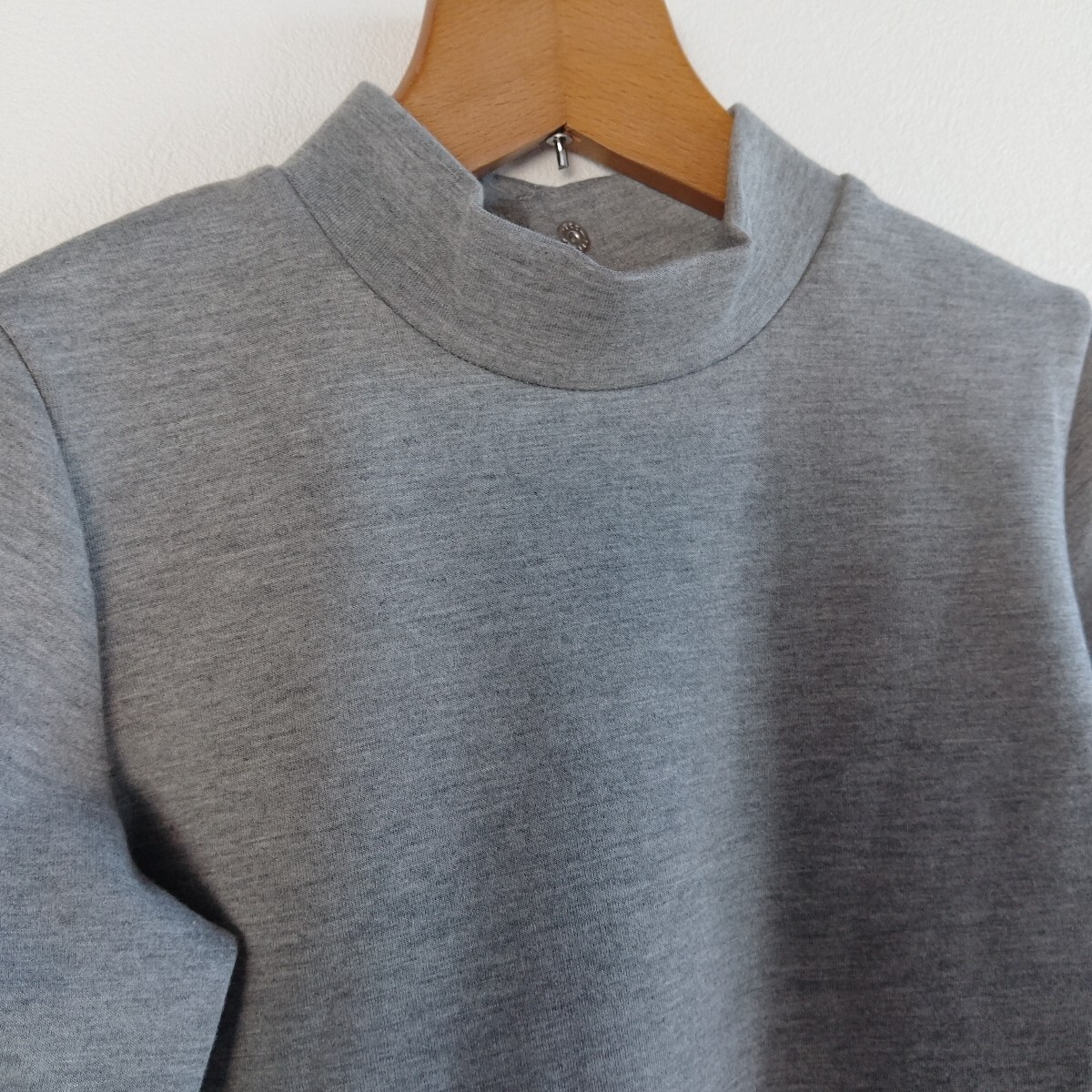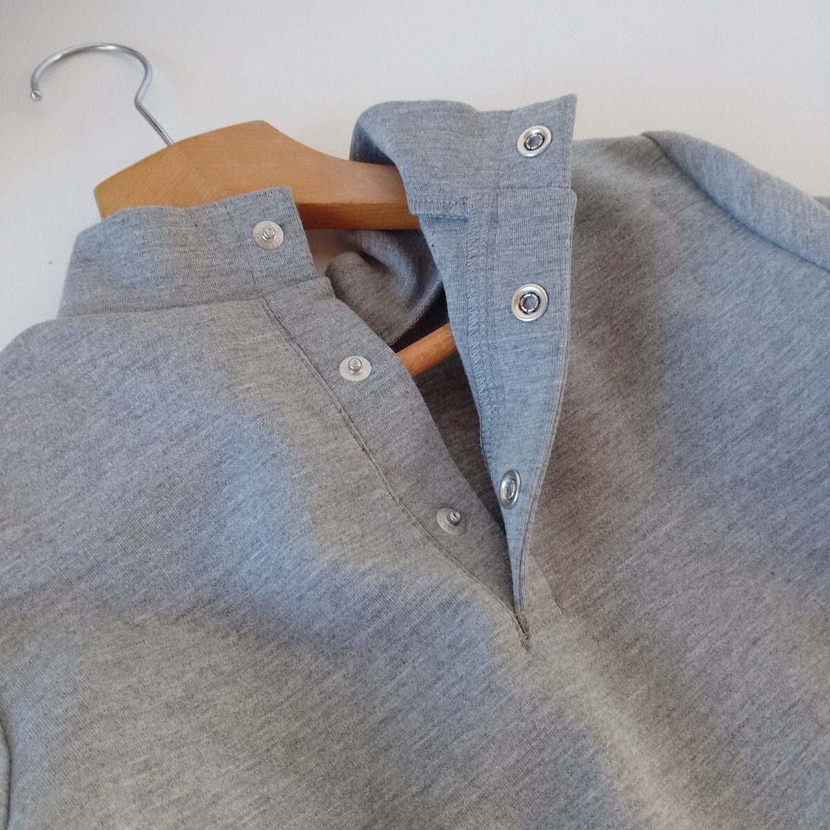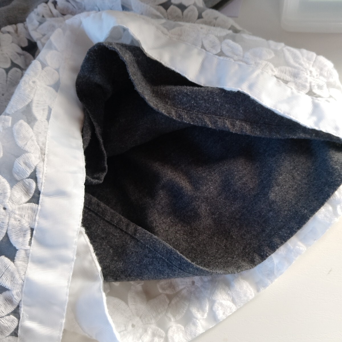 ローネックの薄いグレーポンチワンピースにマーガレットレースが付いたガーリーなワンピースです