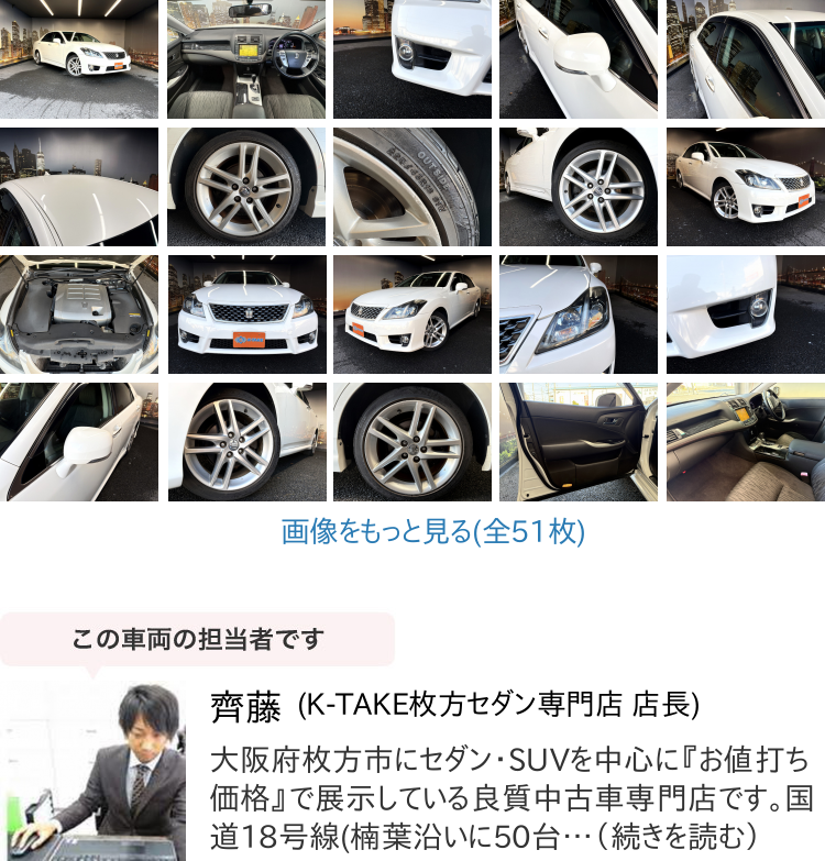 K-TAKE枚方店は国産セダン・SUV・ステーションワゴンを中心に取り扱いしております。趣向性の高い車種になりますので、専門知識を持ったスタッフにてご案内させて頂きます。コーティングやカスタム等はもちろん、任意保険、オートローンまで安心のカーライフをお約束致します。整備、保証などのアフターサービスも当店ですべて行えますのでご安心ください。当社は全国のオークション会場、約160カ所と業務提携を結んでおります。全国60000台以上の中古車を当店でご商談、ご契約、ご納車可能です!