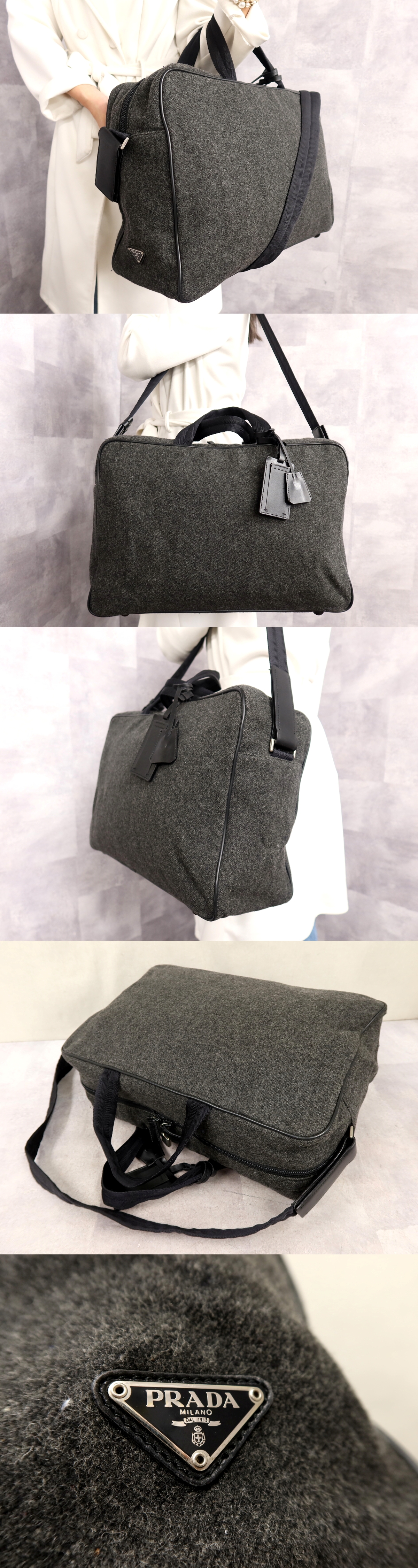Store ●超美品●PRADA プラダ●ウール カーフ レザー 本革●2way ボストン バッグ●グレー●シルバー金具●肩掛け●イタリア製●かばん●Js64066