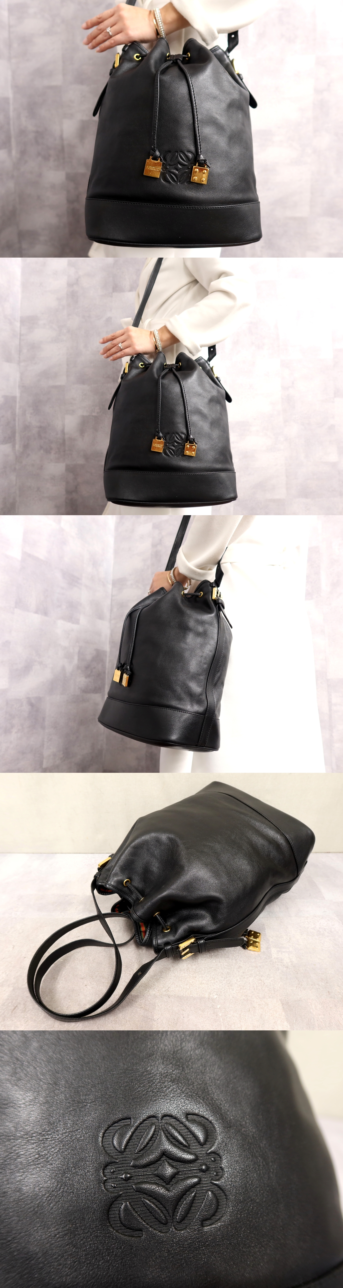 Store ●超美品●LOEWE ロエベ●アナグラム●ロゴ型押し●カーフ レザー 本革●巾着 ショルダー バッグ●黒●ゴールド金具●肩掛け●B5●Js64797