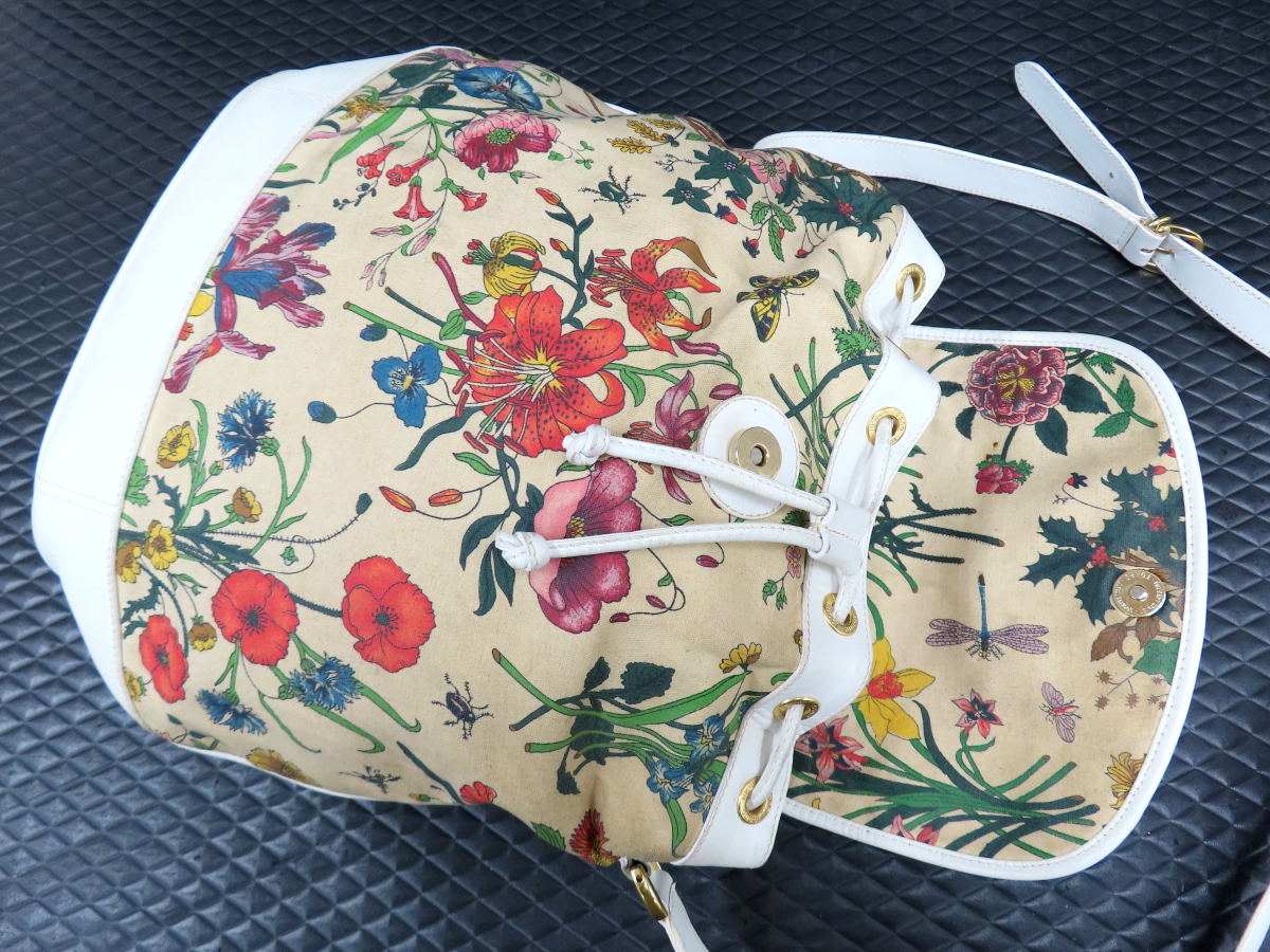 Store ◆GUCCI オールド グッチ◆フローラ◆キャンバス カーフ レザー 本革◆ショルダー バッグ◆白 G金具◆イタリア製◆ヴィンテージ◆A15396