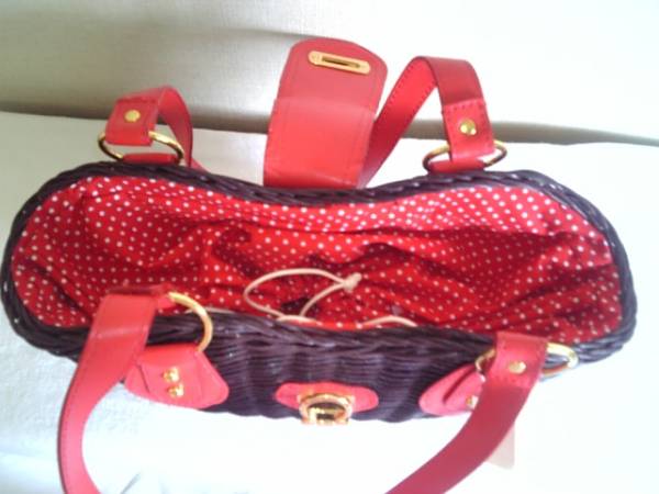 新品タグ付★楕円形のかごバッグ、お色は少しこげ茶っぽい黒かごに赤ベルトになります