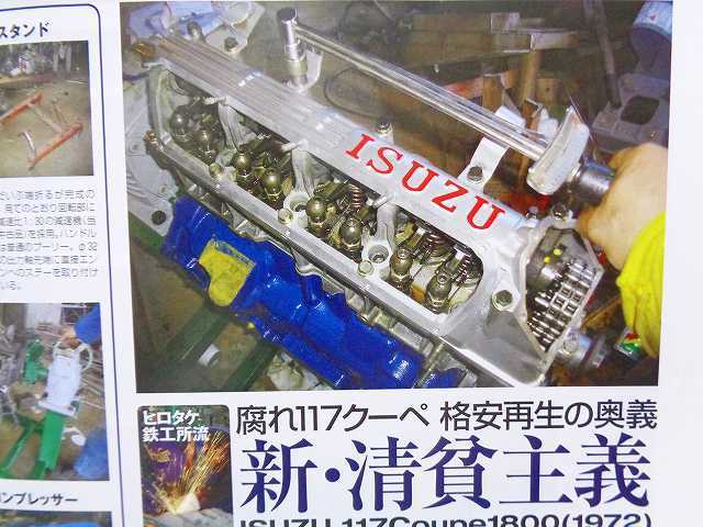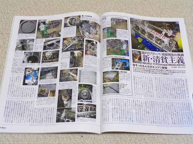 「エンジンOH/117クーペ 再生の奥義」についてはカラー4ページにわたって特集されています。情報が少ないG180SSエンジンのオーバーホール作業工程が写真付きで詳しく解説されています。モデル車両はISUZU 117Coupe1800 1972年式 HM/ハンドメイドタイプです。117クーペオーナー様や旧車の整備をご自分でやられている方、プロ業者様におすすめの内容となっています。