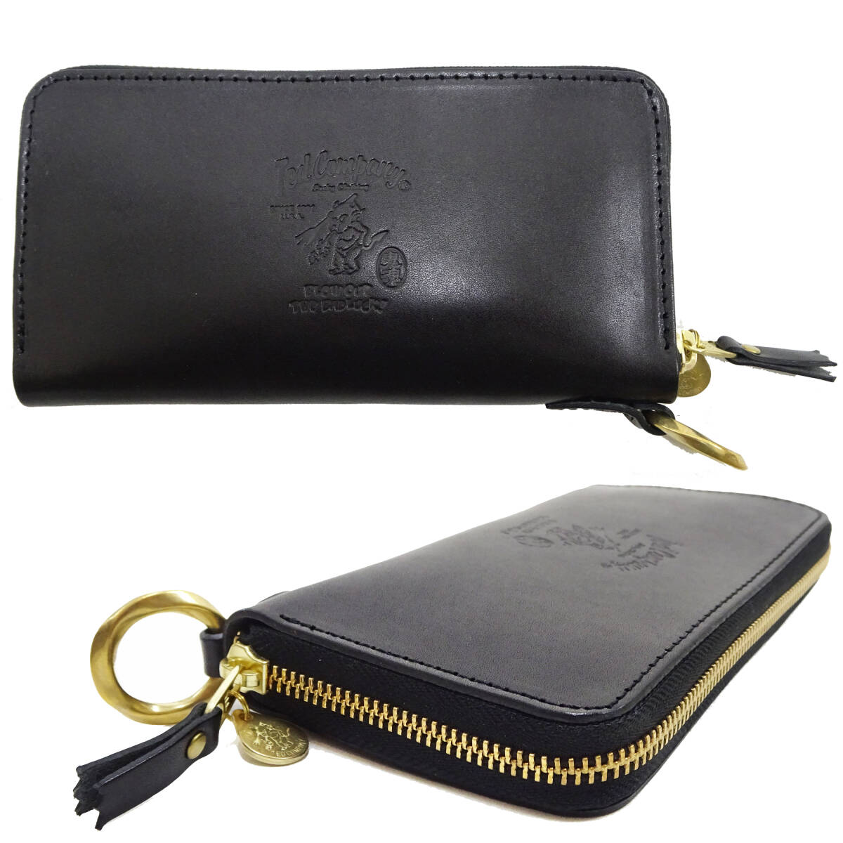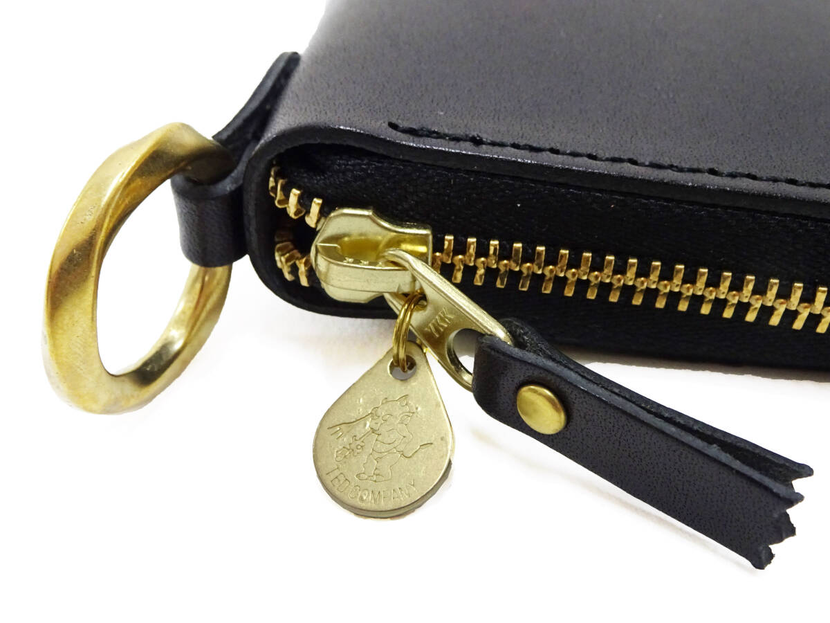 2つ折り(バイフォールド)のロングウォレットで、開閉は3方ラウンドファスナー仕様です。ジップにはゴールドの「YKKジップ」が採用されています。ファスナーの引手にはレザータブとテッドマンの刻印プレートが付きます。