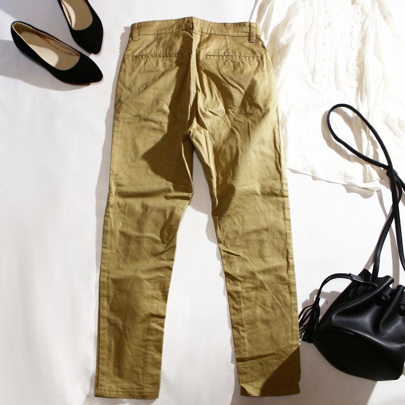 ベージュカラーのコットンパンツ、チノパン感覚でカジュアルに仕様出来るシンプルデザインです。深めのまた上でラクちん綺麗めデザインです。