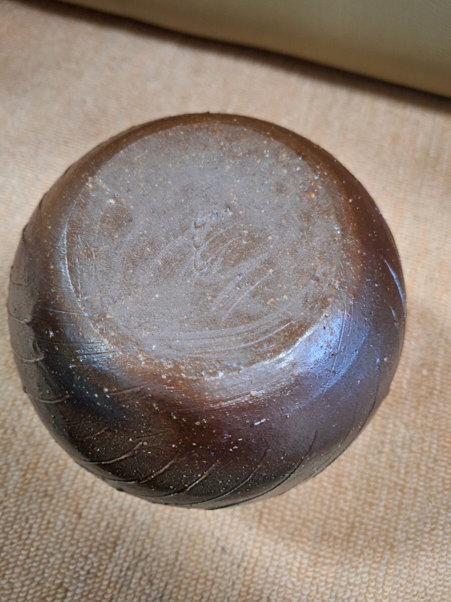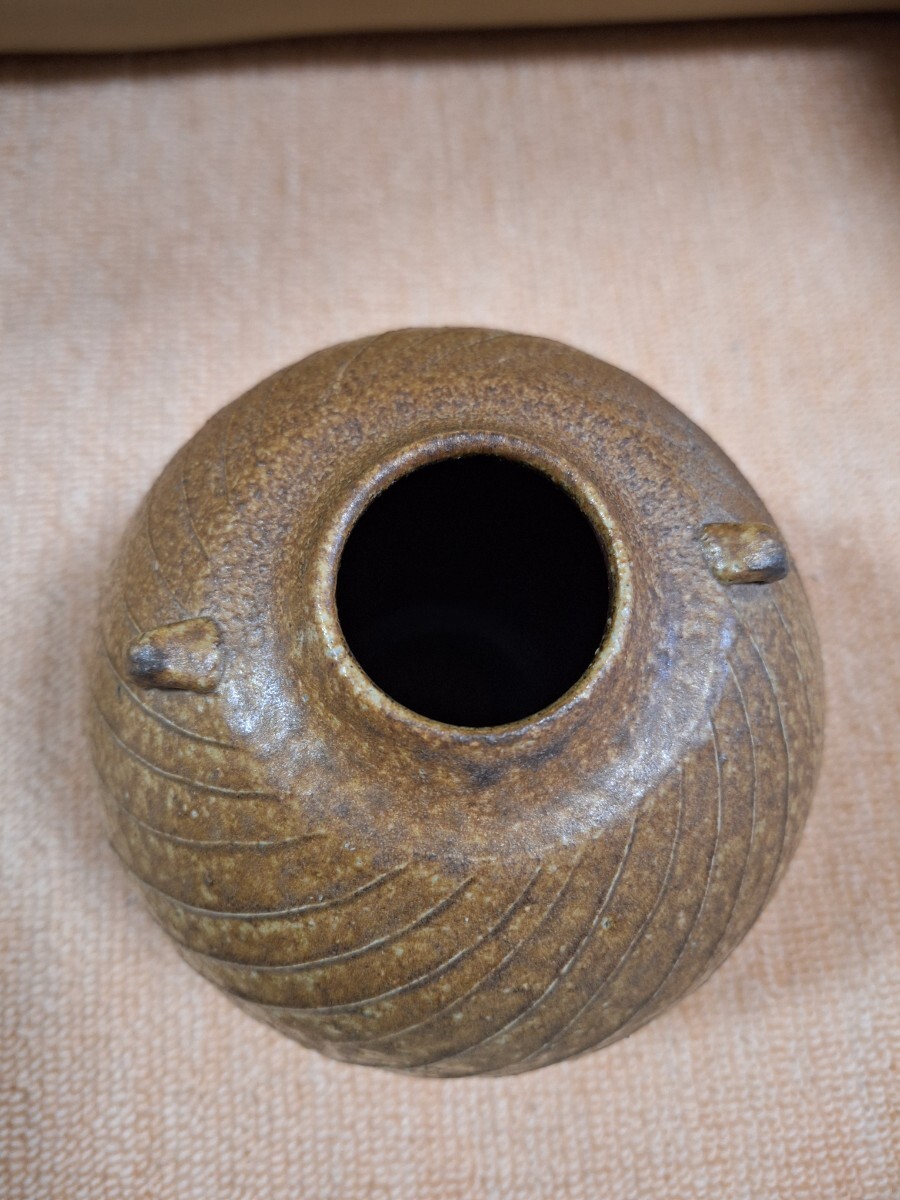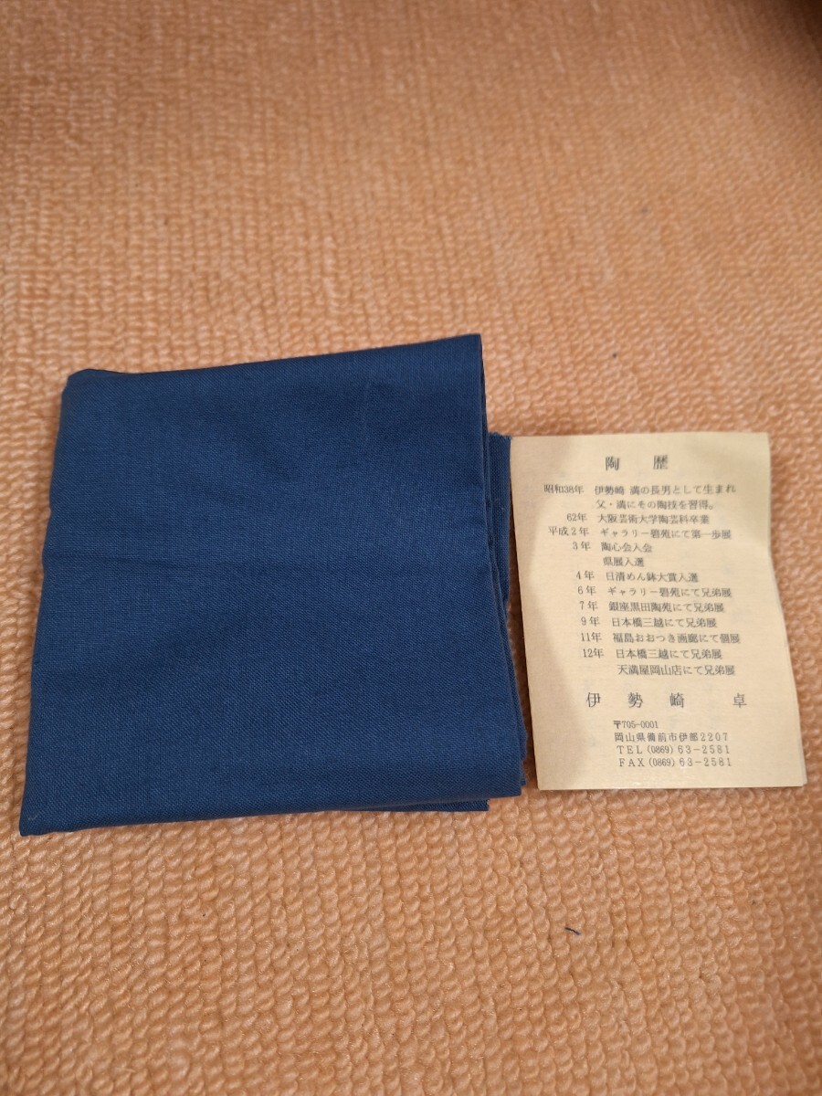 備前焼、耳付き花入、伊勢崎 卓作です。高さ約16cm、胴一番広いところ約15cm、栞、布、共箱入りです。