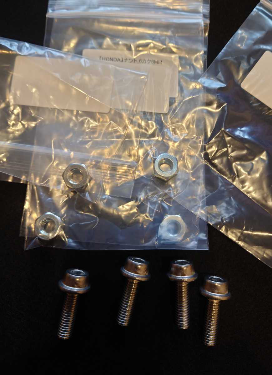 ステンレスの六角穴フランジボルト4本と純正ナット(ネジ径8ミリ2面幅14ミリ)4個です。