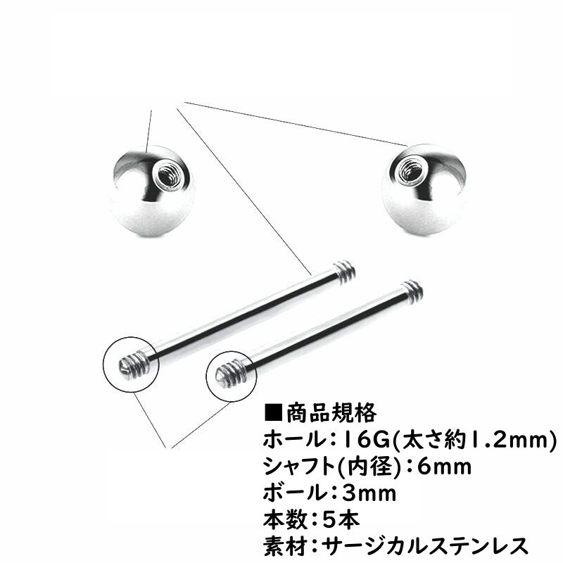 Product name: 5本 ストレートバーベル 16Gシャフト6mm、ボール3mm ボディピアス