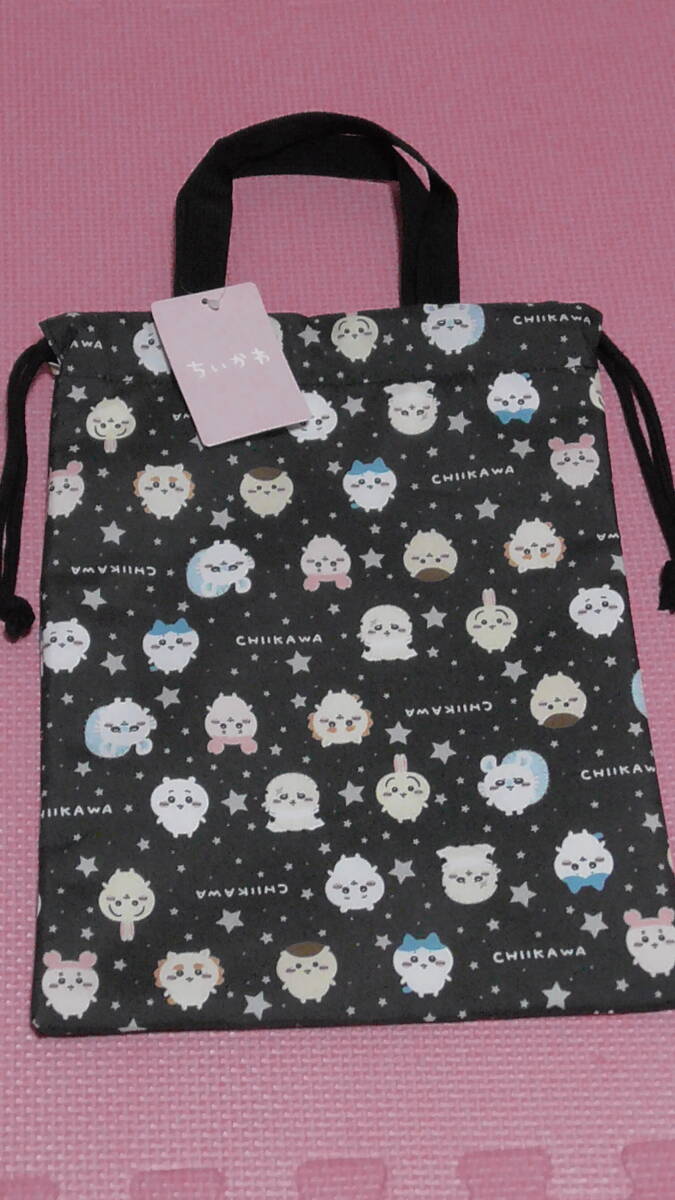 Product name: 新品 ちいかわ 縦型巾着 黒 シューズケース ハチワレ うさぎ モモンガ くりまんじゅう シーサー 古本屋 総柄 手提げ袋 上履き入れ 送料無料