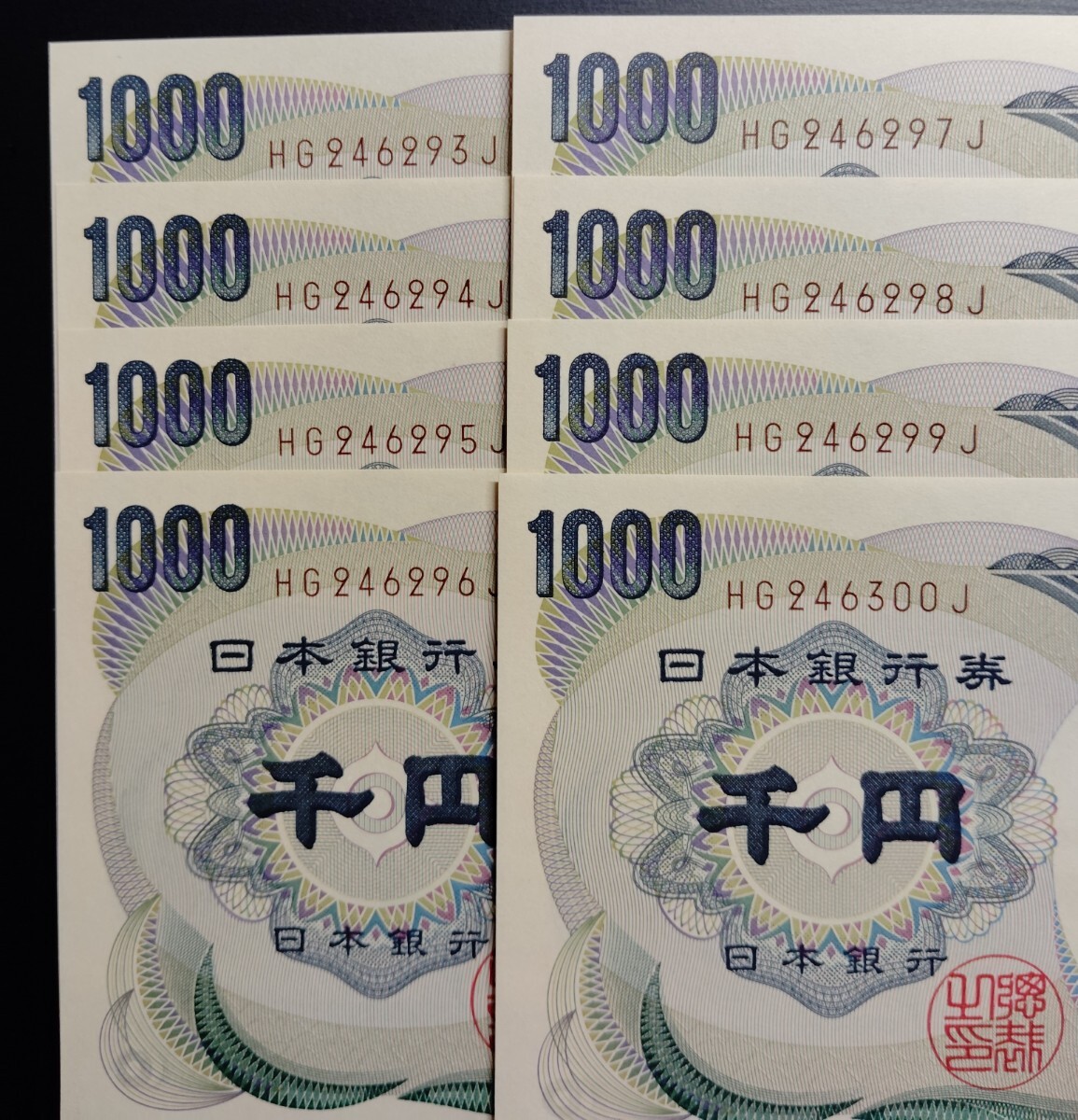 未使用 ピン札シミ焼け無し 日本銀行券 夏目漱石 千円旧紙幣 8連番  大蔵省印刷局製造 帯封出しになります