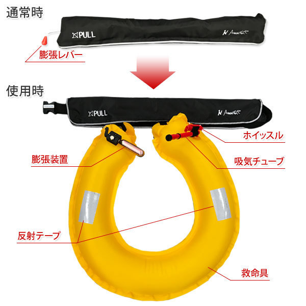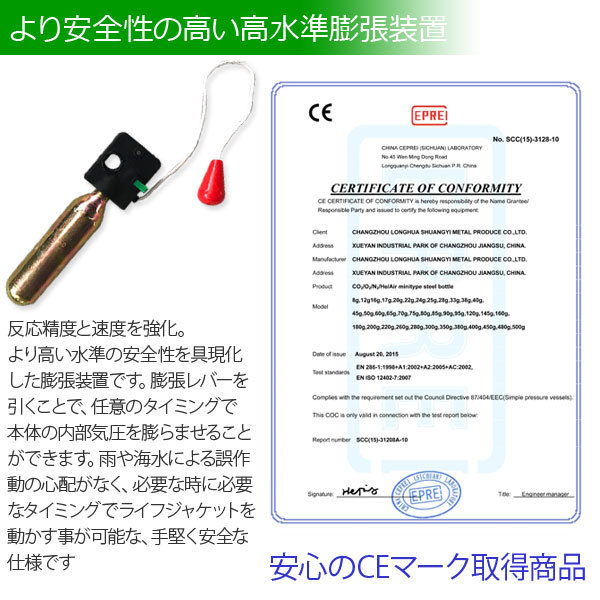 装備品:ボンベ×1・安全ピン×1(手動膨張機能)