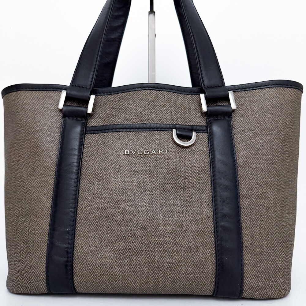 1円■超美品■最高級ライン■BVLGARI ブルガリ ロゴ金具 トートバッグ ビジネス 肩掛け可 メンズ レディース レザー PVC ベージュ