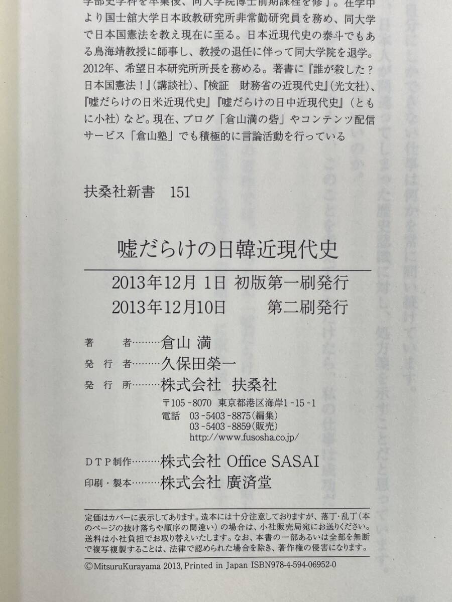 嘘だらけの日韓近現代史 扶桑社新書 倉山満著 平成25年 2013年発行【K153872】