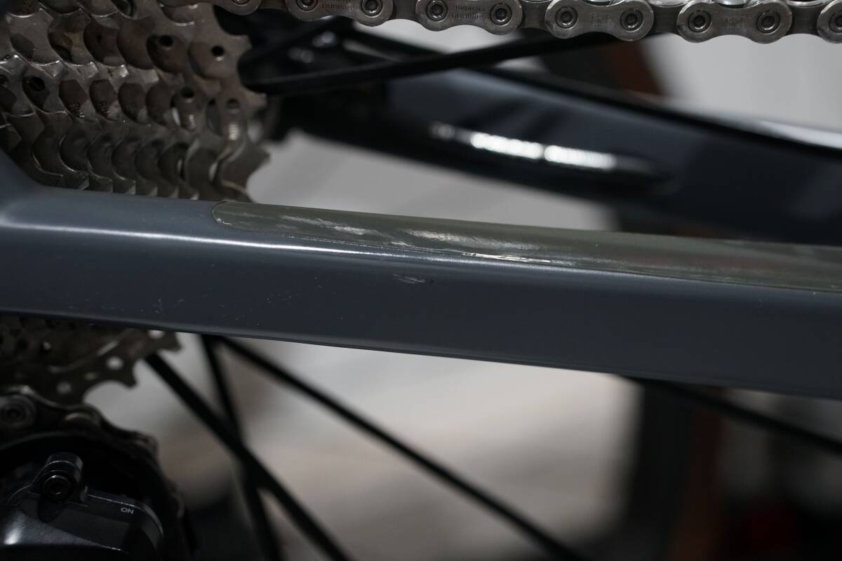 フレームの傷としては、ヘッド部の上左側(ライトが当たった)、右チェーンステー(靴が当たった)の傷以外は目立つ傷はありません、写真の9枚目、10枚目です。複数車両の保有している為に、使用感も少なく落車もありません。