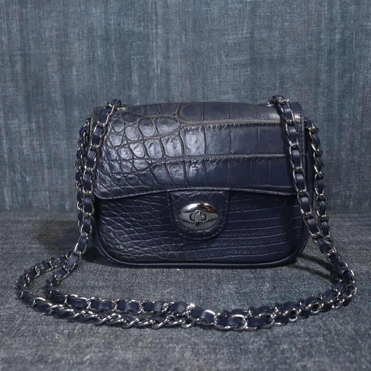 1円スタート クロコダイル ターンロック チェーンショルダーバッグ ネイビー genuine crocodile エキゾチックレザー 1スタ ワニ革